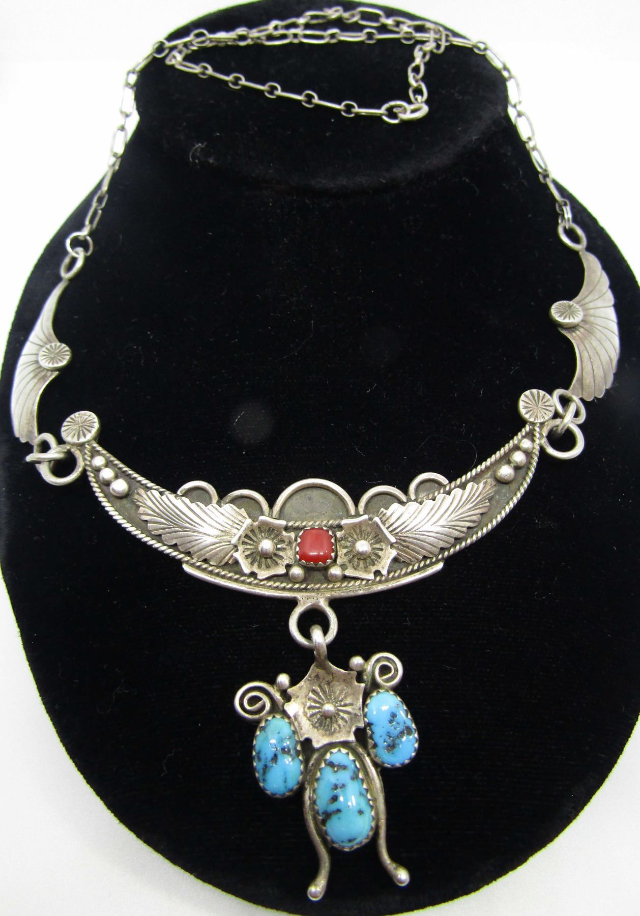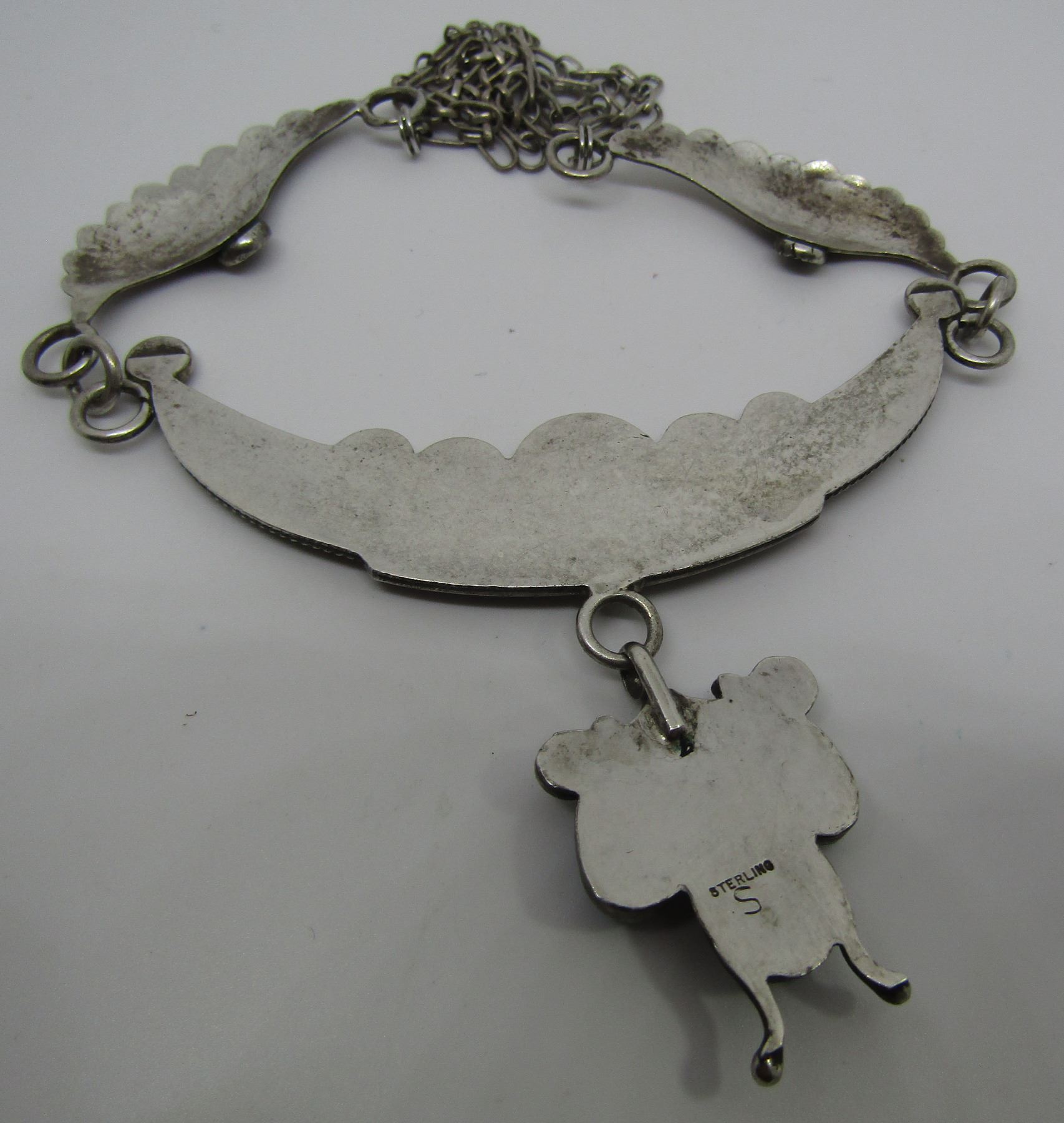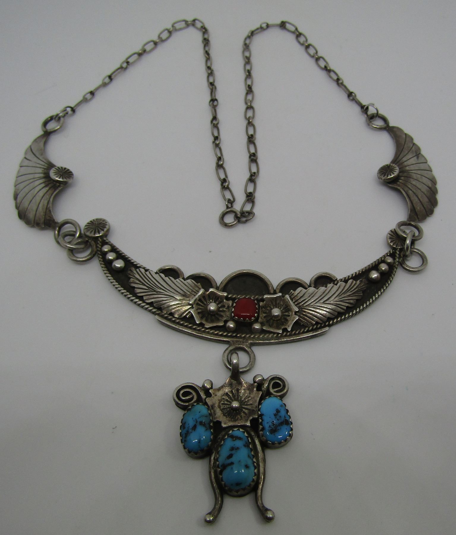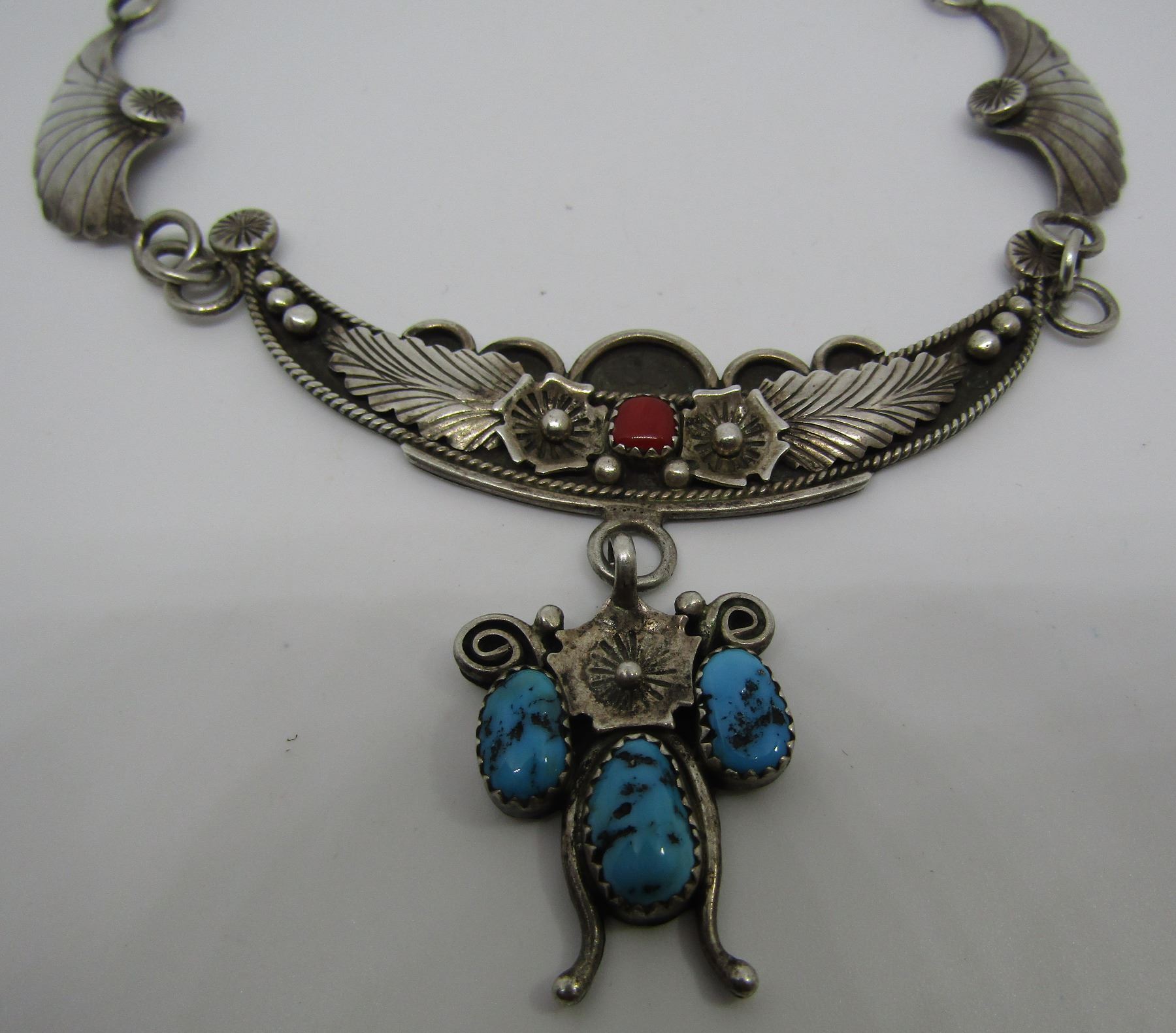 HALLMARKED "S STERLING" SARAH CHEE SQUASH BLOSSOM VINTAGE ESTATE NATIVE AMERICAN SOUTHWEST INDIAN JEWELRY. MEASURES 20 INCHES LONG WITH HUGE 3" WIDE BY 2" LONG CENTERPIECE . WEIGHS 24 GRAMS. EXCELLENTUSED CONDITION. USA SHIPPING $5.