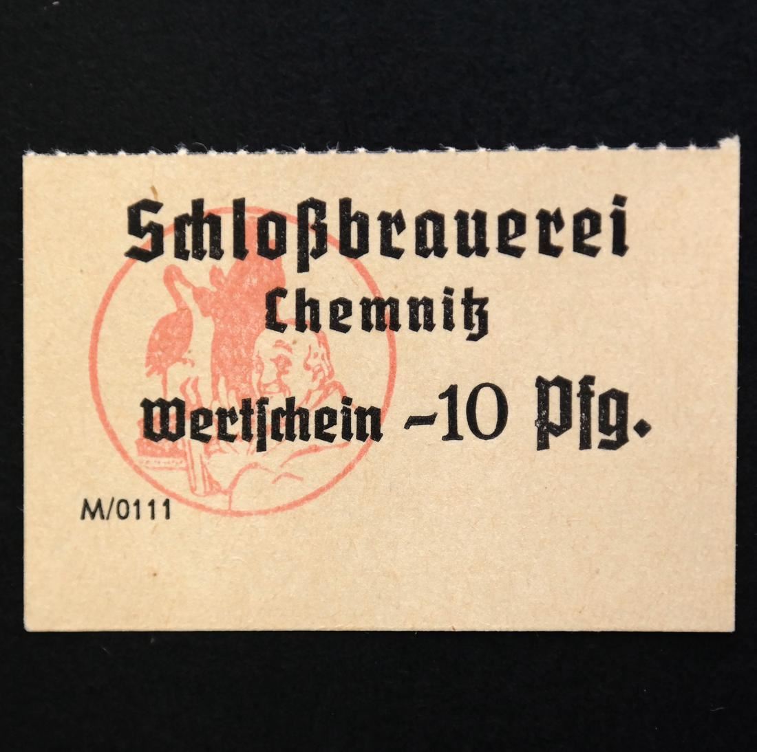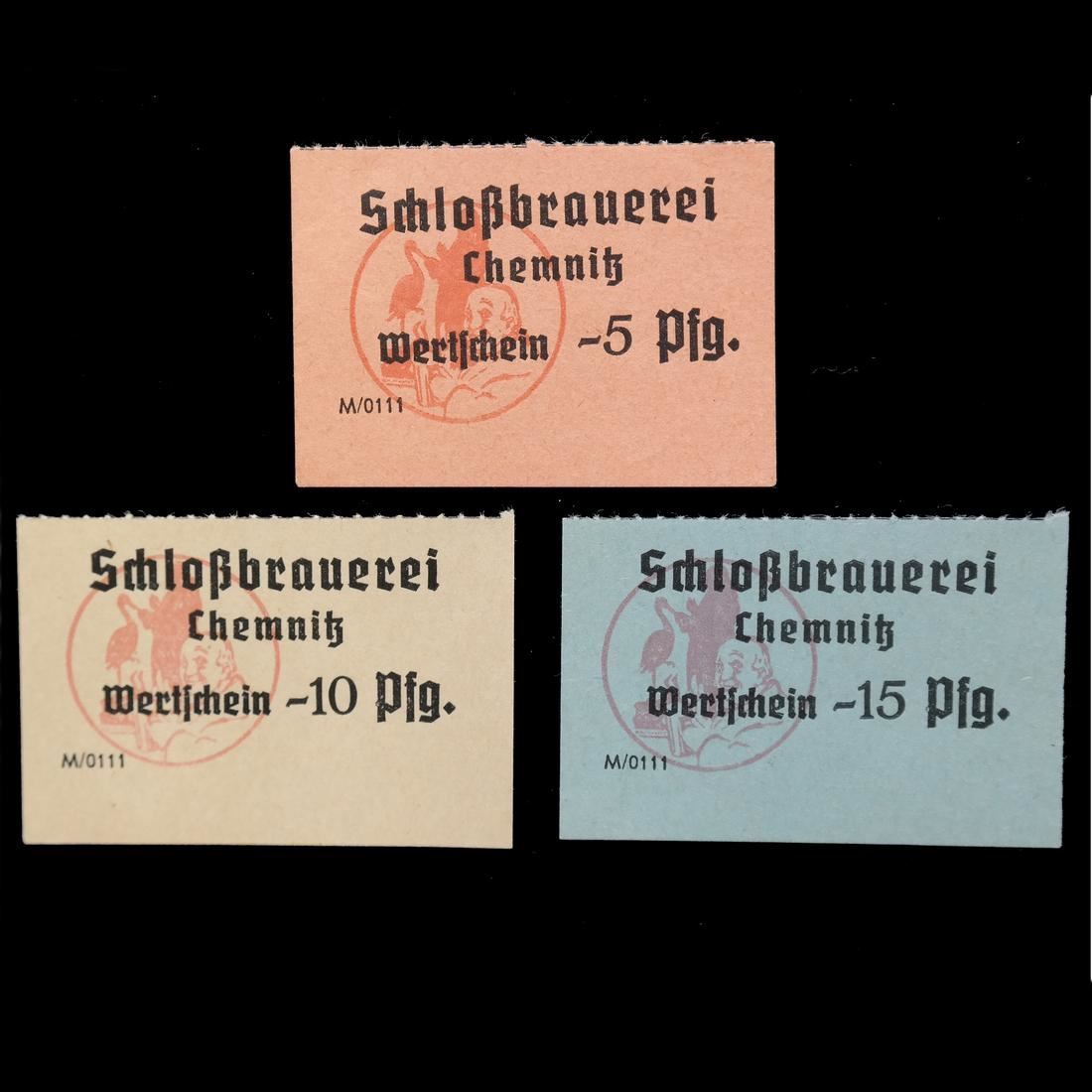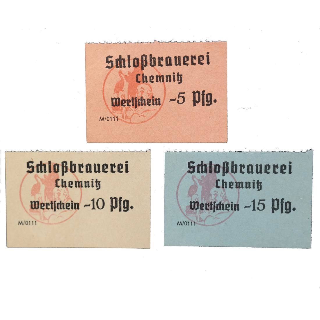 Schlobrauerei / Chemnitz / Wertschein 5pf on salmon, 10pf on yellow and 15pf on pale blue, measure approx 52/53 by 36mm each, perce-en-ligne at top, Uncirculated.