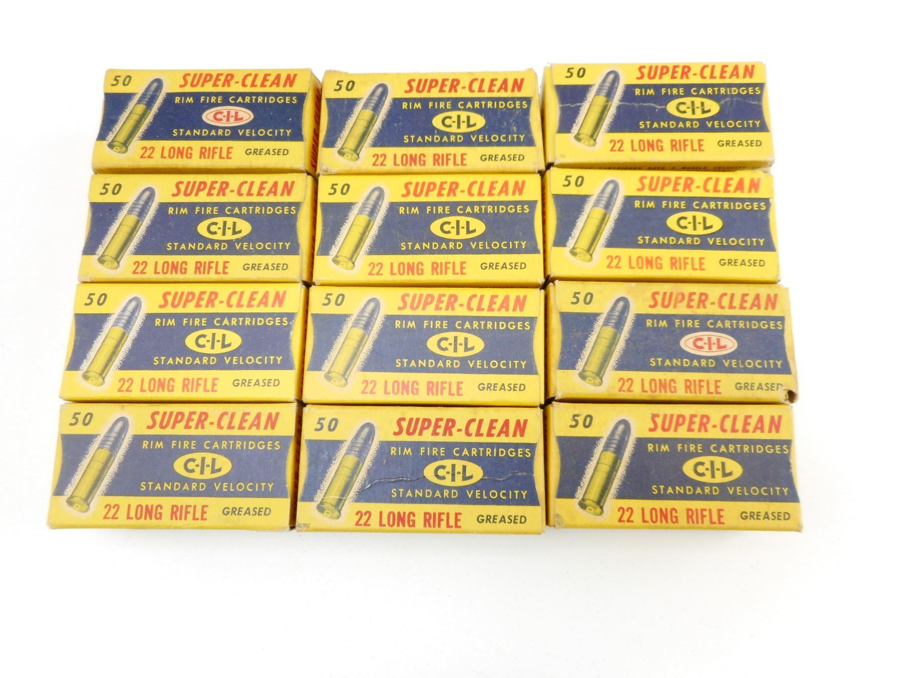 CIL SUPER CLEAN 22 LONG RIFLE AMMO IN VINTAGE BOXES , 550 RNDS CIL 22 LONG RIFLE AMMO, IN VINTAGE BOXES, ON EMPTY VINTAGE BOX