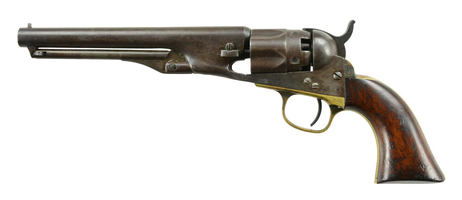 Cal. 36. S# 8555 (1862). Bbl. 6 1/2" w/ New York address. Standard configuration w/ 5-shot fluted cyl & 1 piece walnut grip. Matching numbers on trigger guard, back strap, bbl. & wedge. CONDITION: Bbl. & frame are a brown patina appearance w/ marks & wear. Brass grip straps retain a miniscule amount of original silver plating & faded to a mustard brown patina w/ handling marks. Good worn wood varnish w/ moderate handling marks. Good bore w/ strong lands. PROVENANCE: Estate Collection of Kenneth Horn (Grandson of JC Higgins). (01-20658/MD).ANTIQUE. $500-900.