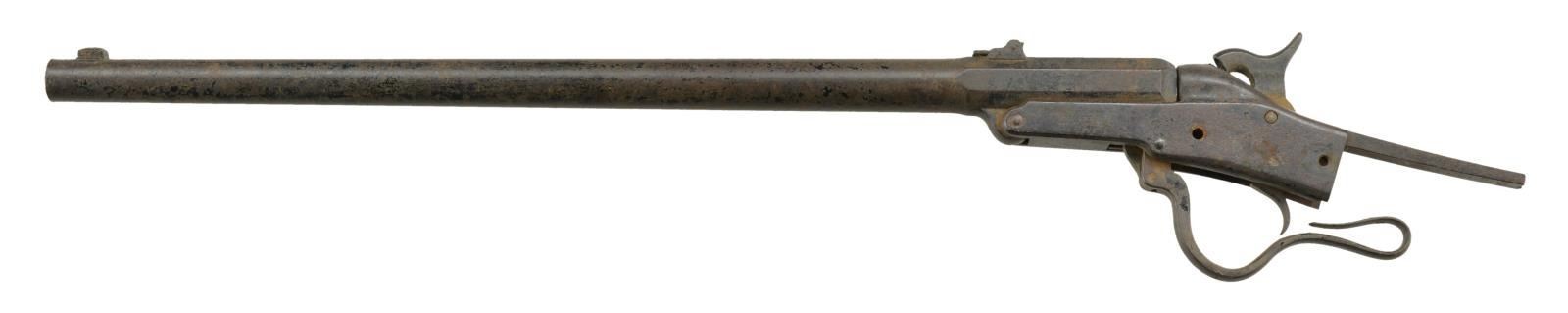 ACTION & BARREL. Cal. 54. NSN. Bbl. 20" w/ blade front & 2 leaf rear sight. Action missing internal parts & stock. CONDITION: poor relic condition w/ flaking finish, oxidation & pitting. Nipple broken. Poor pitted bore. (01-21173/MD). ANTIQUE. $200-400.