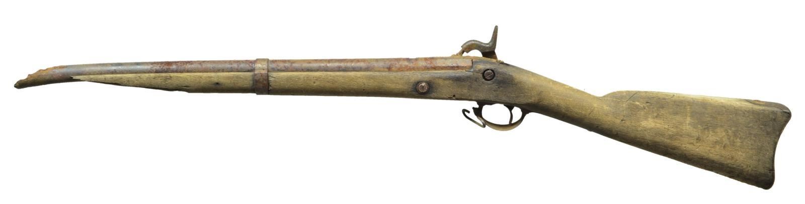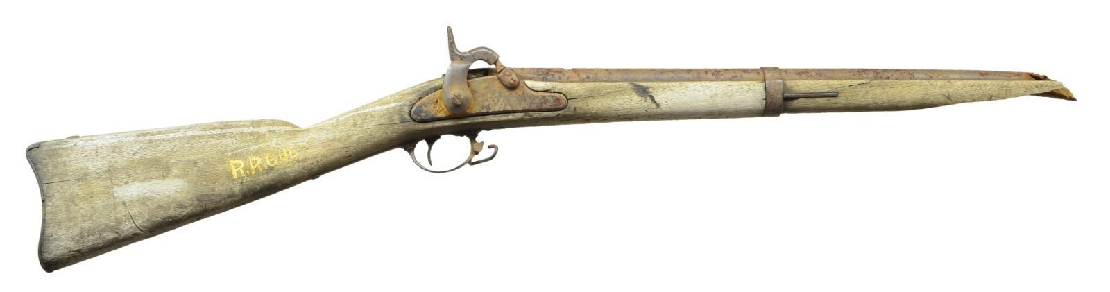 Cal. 58. NSN. Rifle appears to have exploded where only the rear 22" of bbl. remain & stock has 10" portion from rear bbl. band remaining. 1862 Dated lock. Musket stock painted on right side "R.R.Cyt". CONDITION: poor relic condition. (01-21117/MD). ANTIQUE. $200-400.