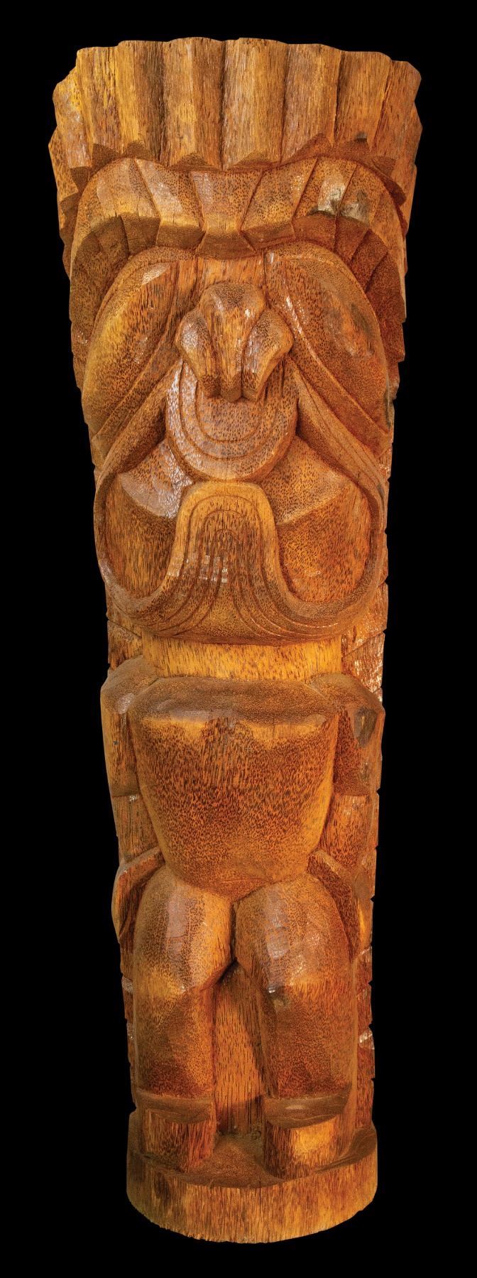 (1970s) A classic idol design of a Ku Hawaiian War god. This type was always on hand in the OA catalog and examples can be found throughout the classic Poly-Pop era. This was most probably carved in Mexico by Demetrio Chavez or another carver in the area contracted under OA. It's highly detailed and features a very dense palm wood. Stunning! 47"x15". VG+.