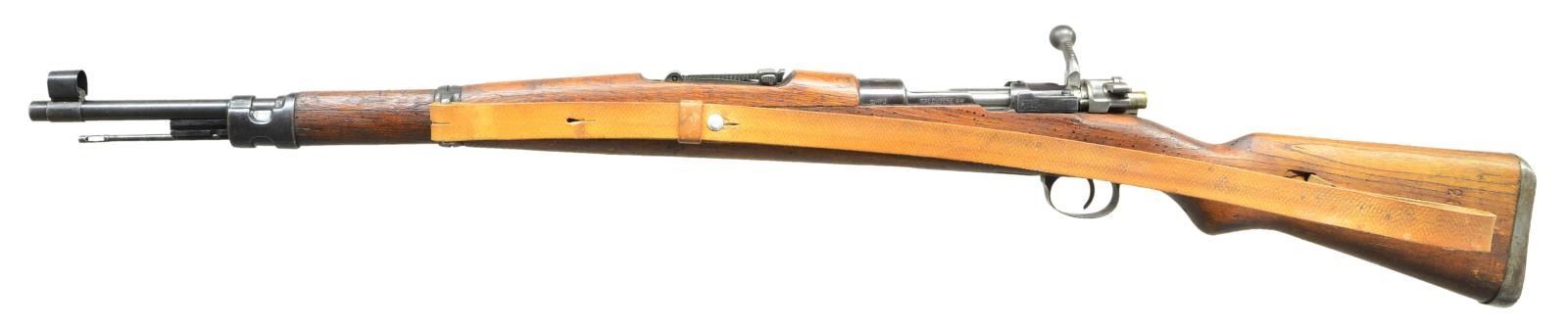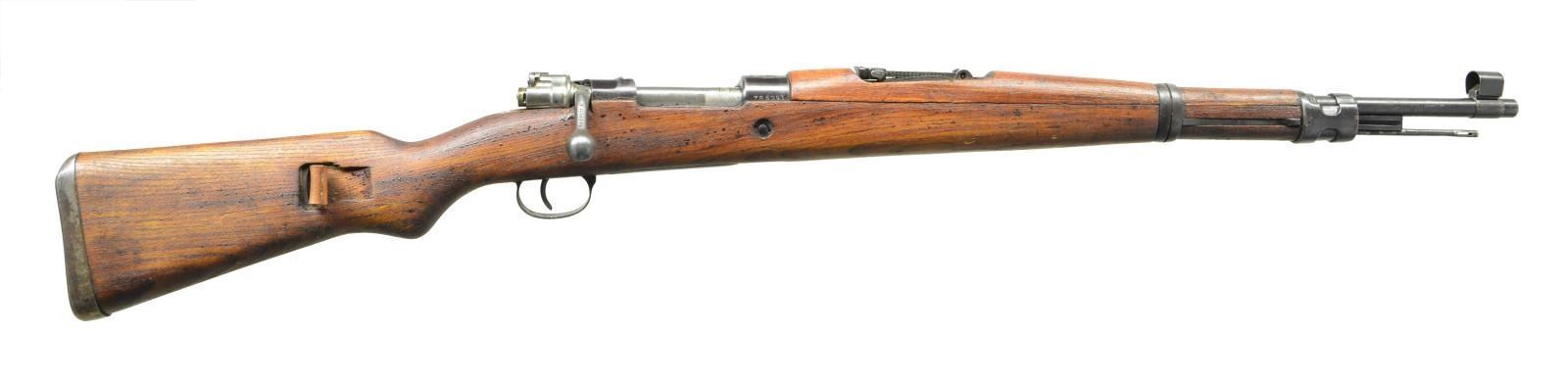 MFG. IN ZASTAVA. Cal. 8mm Mauser. S# T66093. CAI import marked 23.6" bbl. w/ hooded blade front sight & 2000m rear sight. Matching numbered bolt handle, milled floorplate & laminated stock set. Stock has cup type buttplate & 1" wide leather sling. Mfg. 1950-1952. CONDITION: good to very good overall appearance as arsenal reworked w/ handling marks. Blue fading to brown w/ oxidation. Bright buttplate ahs brown patina & oxidation. Stock has moderate handling marks w/ varnish appearing along laminate lines as series of dots. Very good bore. PROVENANCE: from the estate collections of Charles P. Obremski. (22-1366/MD). CURIO. $300-500.