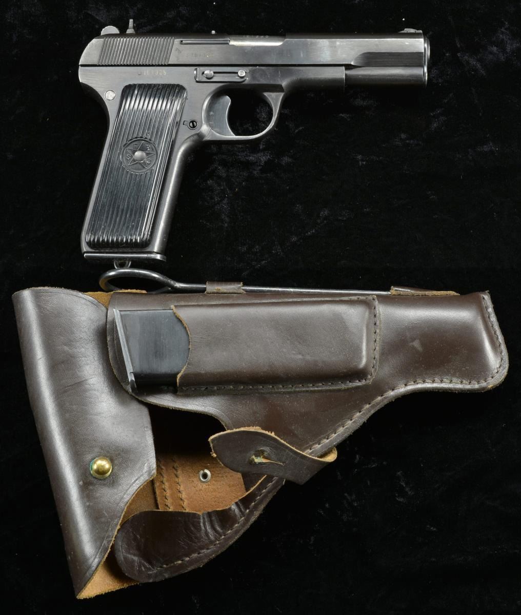 PISTOL. Cal. 7.62x25. S# O161325. Matching numbered 4.6" bbl. PW Arms import mark slide w/ Communist crest on top. Pistol is import compliant w/ added thumb safety on frame along w/ lanyard loop at butt. 2 Piece black plastic grips w/ "SFRJ" & star logo. MAGS: 2 - 9 rd. UNATTACHED ACCESSORIES: brown flap holster w/ cleaning rod. CONDITION: Very good as arsenal refinished. Very good bore. (22-773/MD). MODERN. $200-400.
