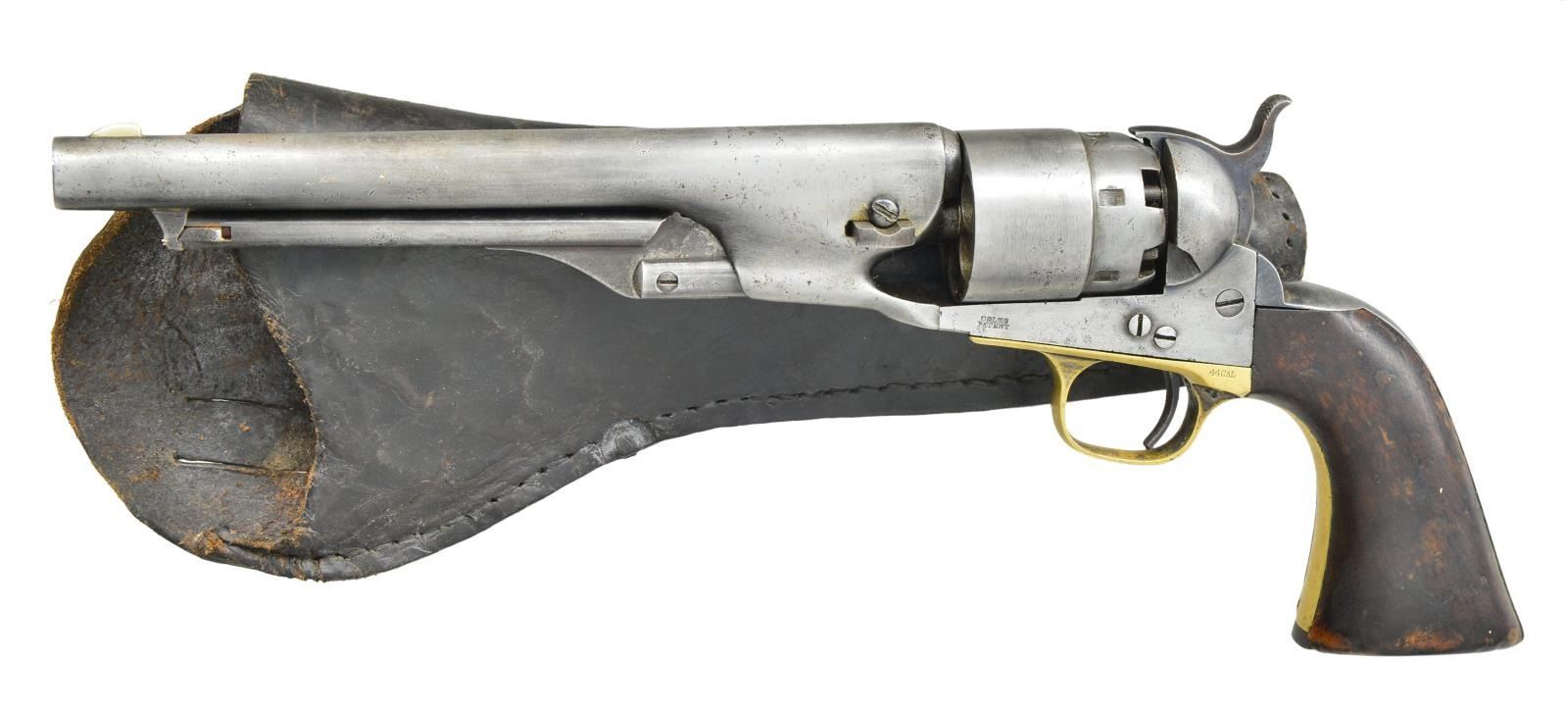 Cal. 44. S# 41380. Bbl. 8" rnd. w/ New York address. 6 Shot rd. rebated roll engraved cyl. Brass trigger guard. 1 Piece walnut grip. Bbl. frame & grip straps have matching S#/ "2" 2. Cyl. number is eligible. Replacement wedge is unnumbered. 1863 Mfg. UNATTACHED ACCESSORIES: unmarked leather belt holster. CONDITION: metal has a cleaned gray appearance showing scattered spots of pitting & sm. dents. Hammer retains 50% cased colors on sides & maybe replacement. Cleaned trigger guard retains traces of silver finish. Grips have a dark refinished appearance w/ plastic wood repairs around butt. Functioning action. Lightly pitted bore retains sound rifling. PROVENANCE: Collection of John Montague. (01-20768/DS). ANTIQUE. $700-900.