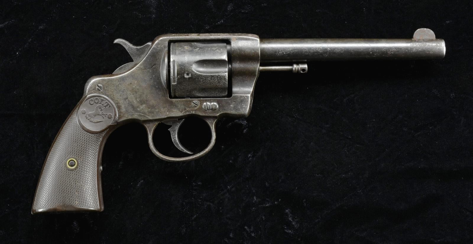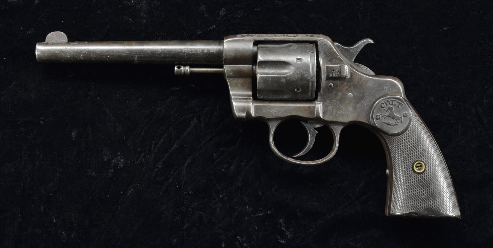 Cal. 41 Colt. S# 149478 (1901). Mfg. in New Army & New Navy S# range w/out martial marks & having Navy style 2 piece hard rubber grips. Bbl. 6" w/ fixed sights. 6 shot swing out cyl. Assembly # "961" on cyl. latch & yoke. CONDITION: fair over. Metal turned brown w/ oxidation & pitting. Worn grips w/ chips & cracks. Good lightly pitted bore. PROVENANCE: Estate Collection of Jack Verret Sr. (22-883/MD). CURIO. $100-200.