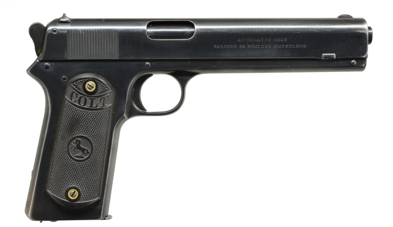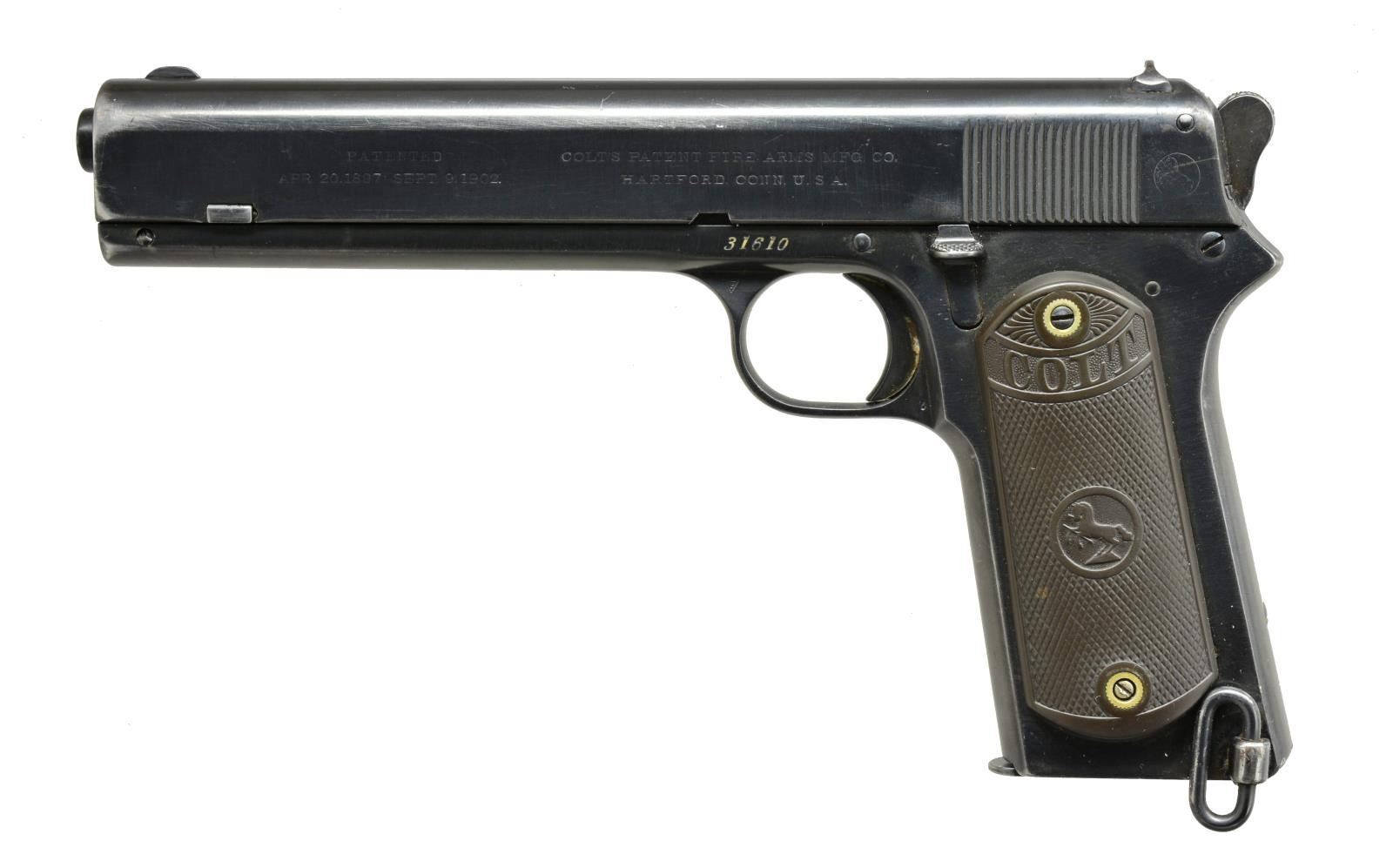 Cal. 38 ACP. S# 31610. Bbl. 6". Semi circular front sight w/ U-notch rear sight. Left side of slide has 2 line patent markings having 1897 & 1902 dates w/ Rampant Colt behind serrations. Rnd. hammer. Left side of frame has lanyard loop. 2 Piece checkered hard rubber grips. 1908 Mfg. MAGS: 1 detachable 8 rd. CONDITION: 80% reblued finish showing some remaining scratches & marks. Grips show moderate wear. Bright bore retains strong rifling. (21-1353/DS). CURIO. $900-1,300.
