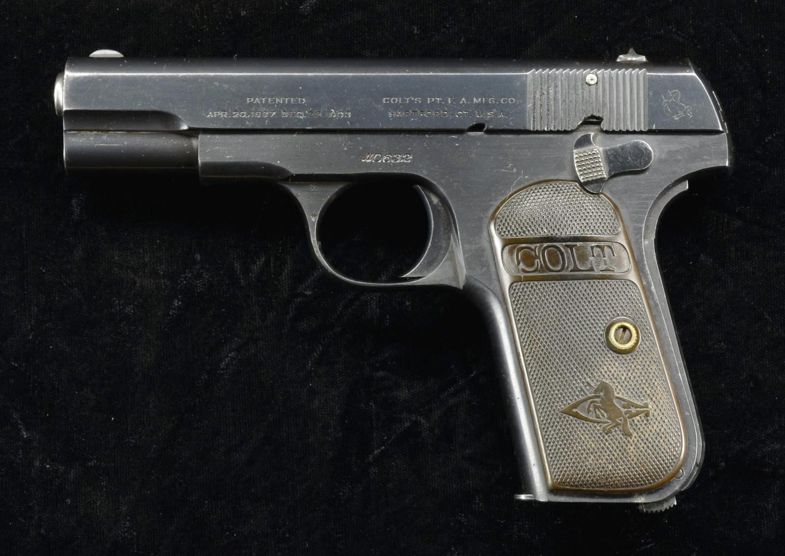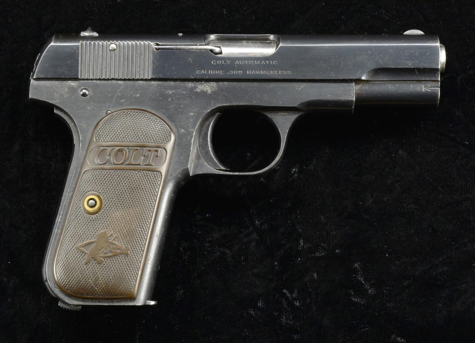 PISTOL. Cal. 380 ACP. S# 40632 (1921). Bbl. 3 3/4". Blue finished w/ fixed sights & 2 piece hard rubber grips. MAGS: 1 - 8 rd. marked on bottom "CAL 380 / COLT". CONDITION: good overall appearance w/ refinished blue having peppery oxidation & cycling wear. Replacement rear sight. Good bore w/ darkness in grooves. (22-2008/MD). CURIO. $650-900.