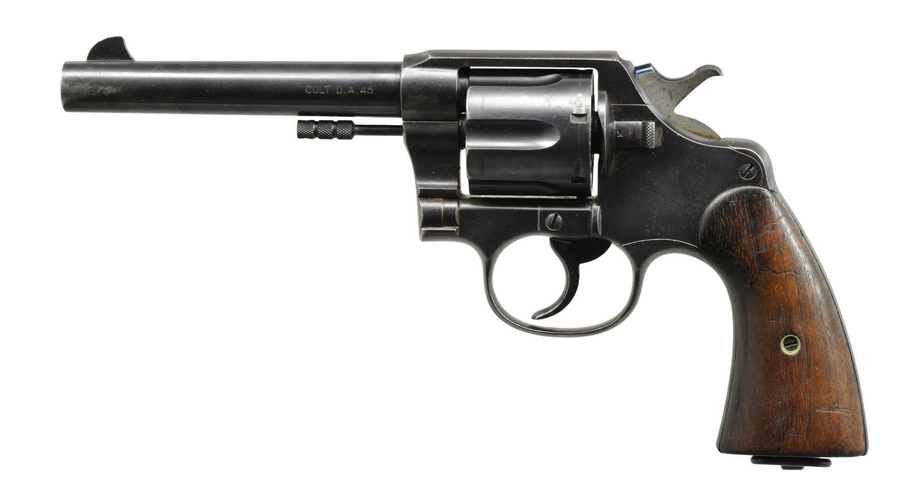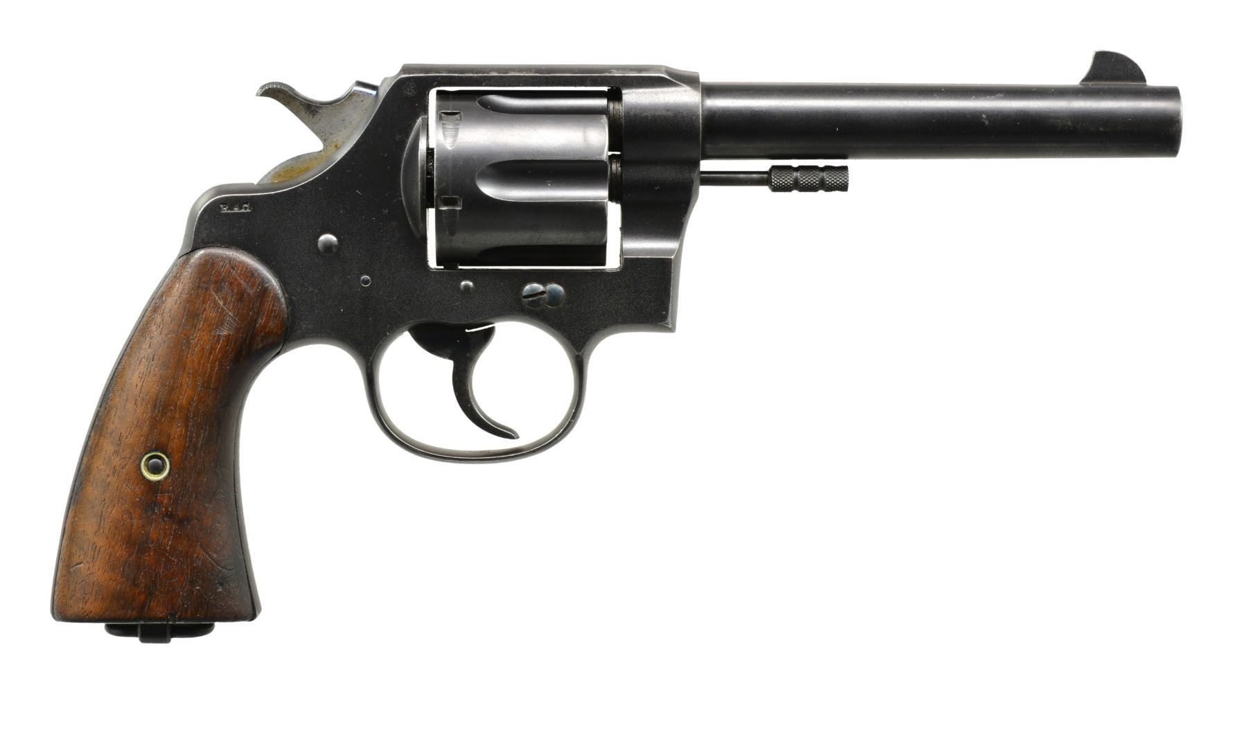 Cal. 45 Colt. S# 48262. Bbl. 5 1/2" w/ blade front sight. 6 Shot fluted cyl. Blue finish w/ fire blued trigger & fire blue hammer having polished sides. Right side of frame has "R.A.C." inspectors mark. Butt of gun is marked "U.S. / ARMY / MODEL / 1909" above lanyard ring, followed by "No / 48 / 262". 2 Piece walnut grips. S# indicates 1911 mfg. CONDITION: 70% dull fading blue w/ lightly frosted appearance on frame w/ spots of pitting. Grips have dark worn appearance w/ numerous scratches w/ dents at butt. Bore is bright w/ sound rifling. (20-1288/DS). CURIO. $1,500-2,200.