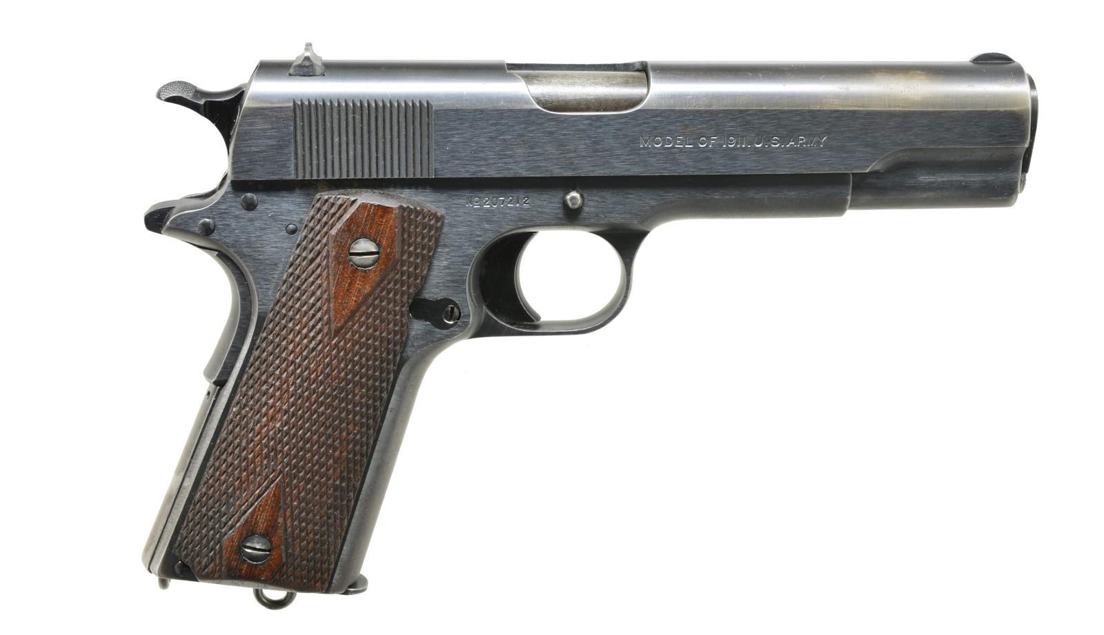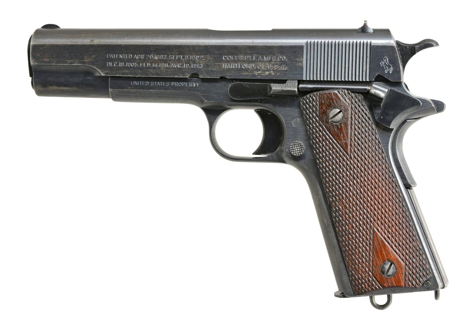 Cal. 45 ACP. S# 207212. Bbl. 5" blued. Top of bbl. stamped "PH". Left side of leg stamped "J". Brushed blue finish on slide & frame. Diamond checkered walnut grips. Semi circular front sight w/ U notch rear sight. Checkered long beavertail hammer w/ rounded tip. Left side of frame has circular "GHS" inspection initial w/ "UNITED STATES PROPERTY" mark in front of triggerguard. Left side of slide has Rampant Colt behind serrations. 1917 Mfg. MAGS: 1 detachable 7 rd. w/ pinned base having lanyard loop. CONDITION: metal retains over 90% original brushed blue finish showing light & muzzle wear w/ scattered sm. spots of very light pitting. Grips show moderate wear w/ a few chipped diamonds. Lightly pitted bore w/ worn rifling. (20-3317/DS). CURIO. $3,000-4,000.