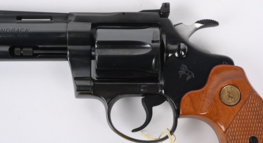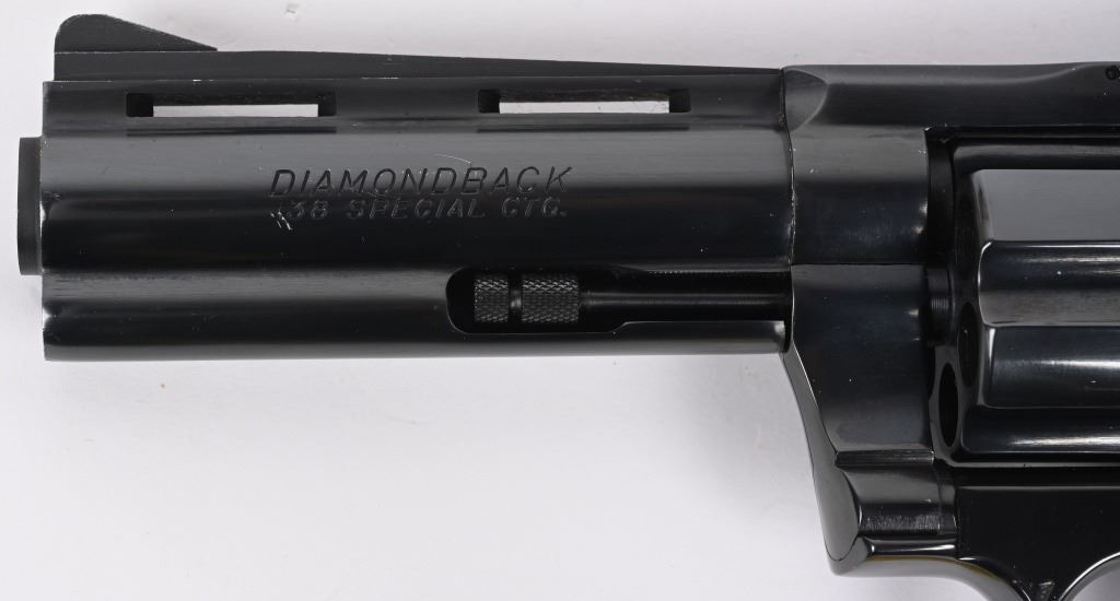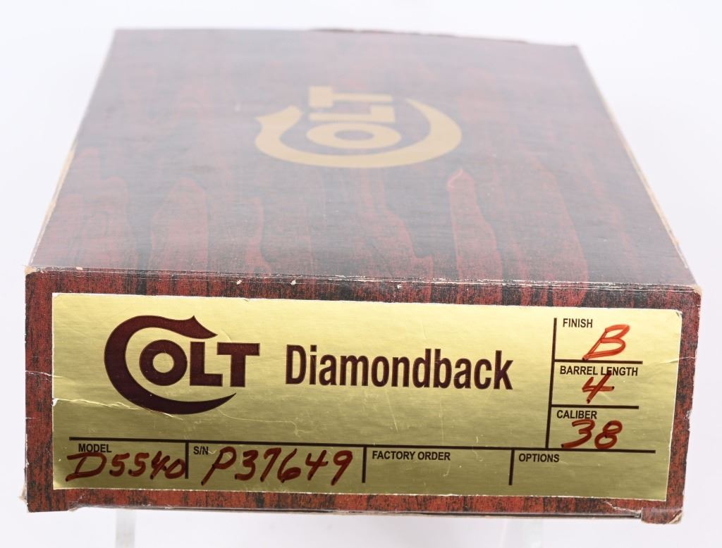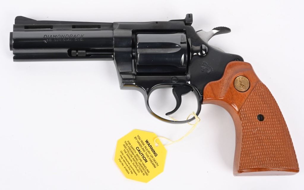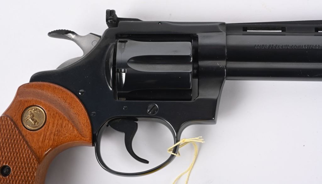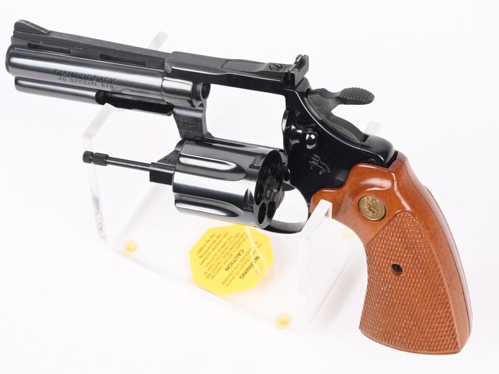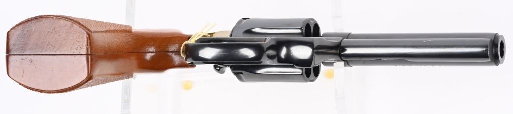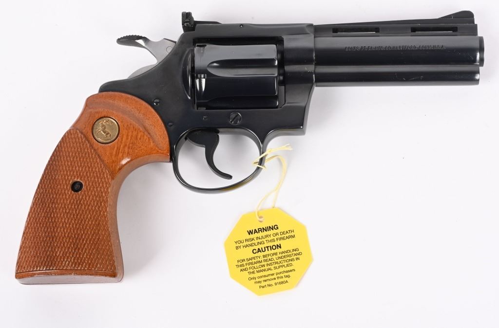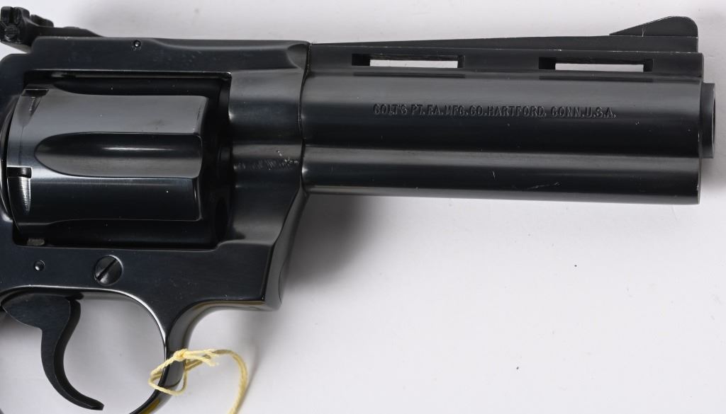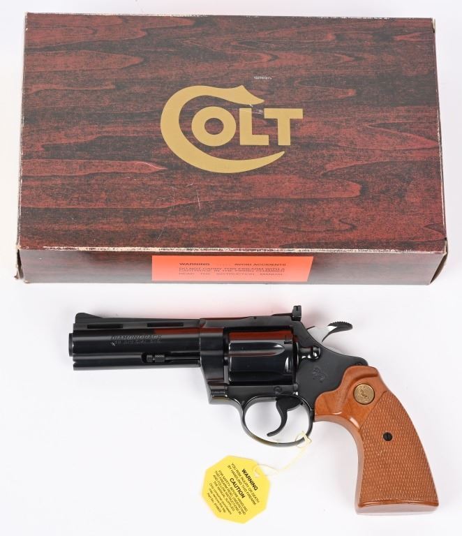 SERIAL NUMBER: P37649. BARREL: 4". CALIBER: .38 SPECIAL. MANUFACTURED: 1982. Standard markings and features. Six shot fluted cylinder. Full vent rib on the barrel, with blade front sight and adjustable u-notch rear. Original blued finish and checkered wood grips with gold medallions. Polished spurred hammer. Includes serial matching box, with manual/papers. CONDITION: Metal is excellent overall, minus a few scratches on the left side of the barrel. Grips are excellent overall. Bore is shiny with crisp rifling. Sharp mechanics. Fired very little, with no drag line on the cylinder. Box is excellent. MODERN