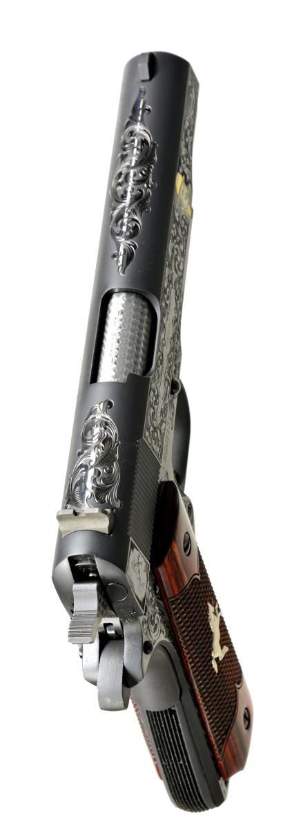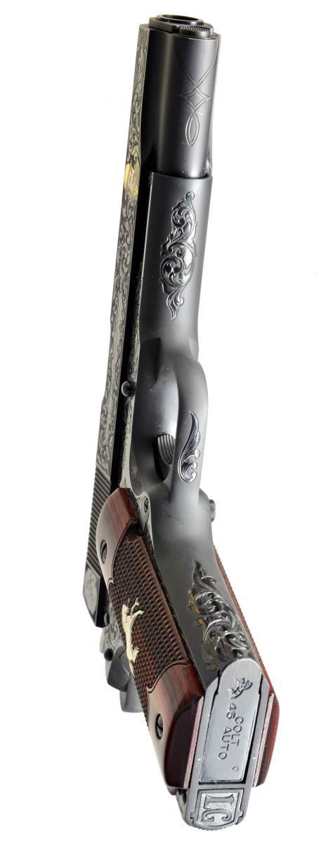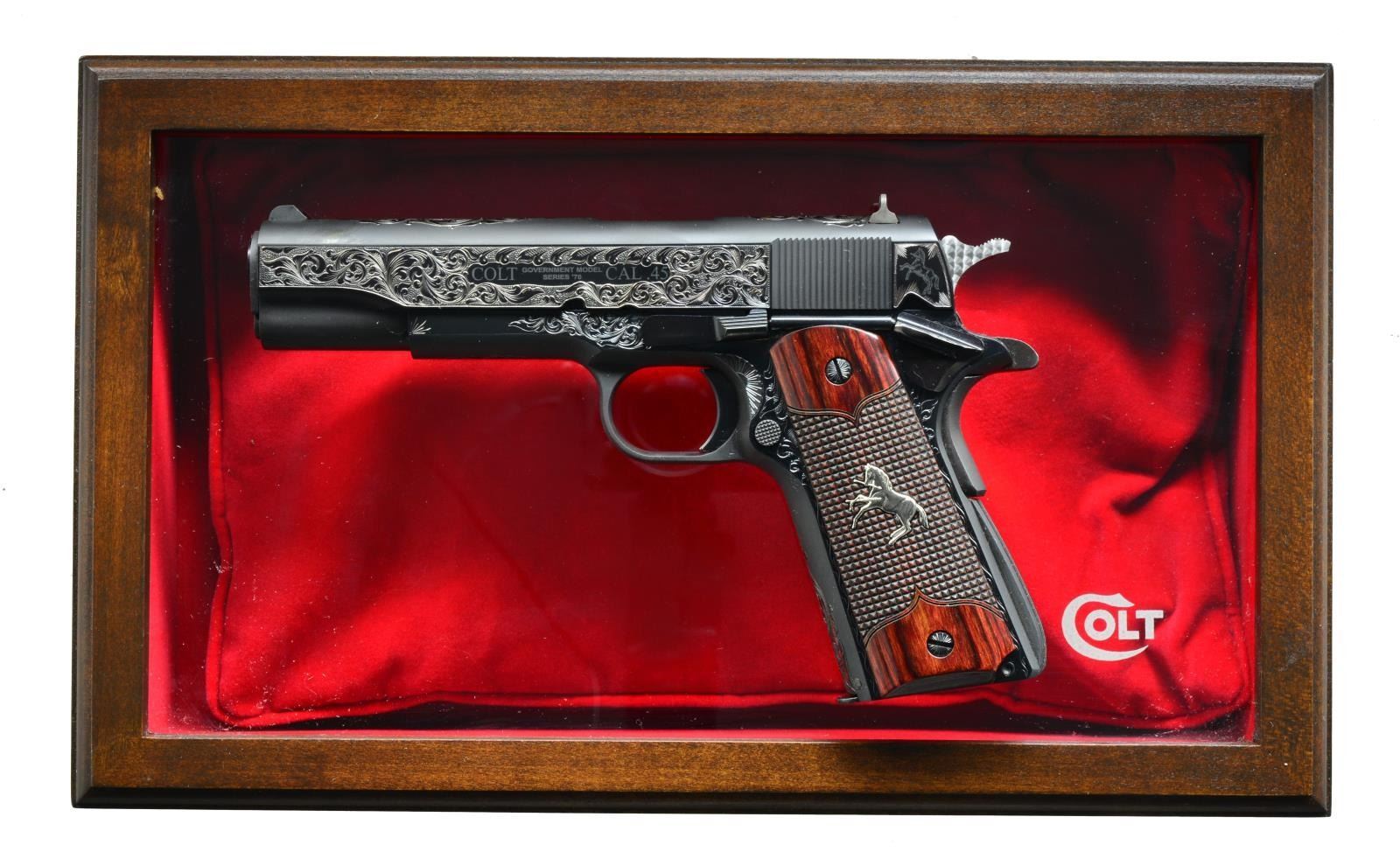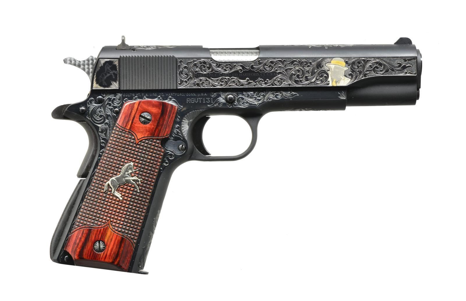 SHOP SEMI AUTO PISTOL. Cal. 45 ACP. S# RGVT131. Bbl. 5". 50% Coverage vine type foliate scroll engraving w/ punch dot backgrounds. Right side of slide has Silver & gold portrait of notorious Prohibition Era mob boss Al Capone. Bright blue finish w/ matte finished Grip straps as well as upper & lower areas of slide. Chamber area of bbl. & sides of hammer have jeweled finish. 2 Piece laminated grips w/ square cut checkering having Rampant Colt inlays & gloss finish. Butt of gun is marked w/ initials "LG". 2013 Mfg. UNATTACHED ACCESSORIES: colt marked glass fronted display case w/ red velour interior containing case key. CONDITION: as new & unfired. (20-3988/DS). MODERN. $3,000-5,000.