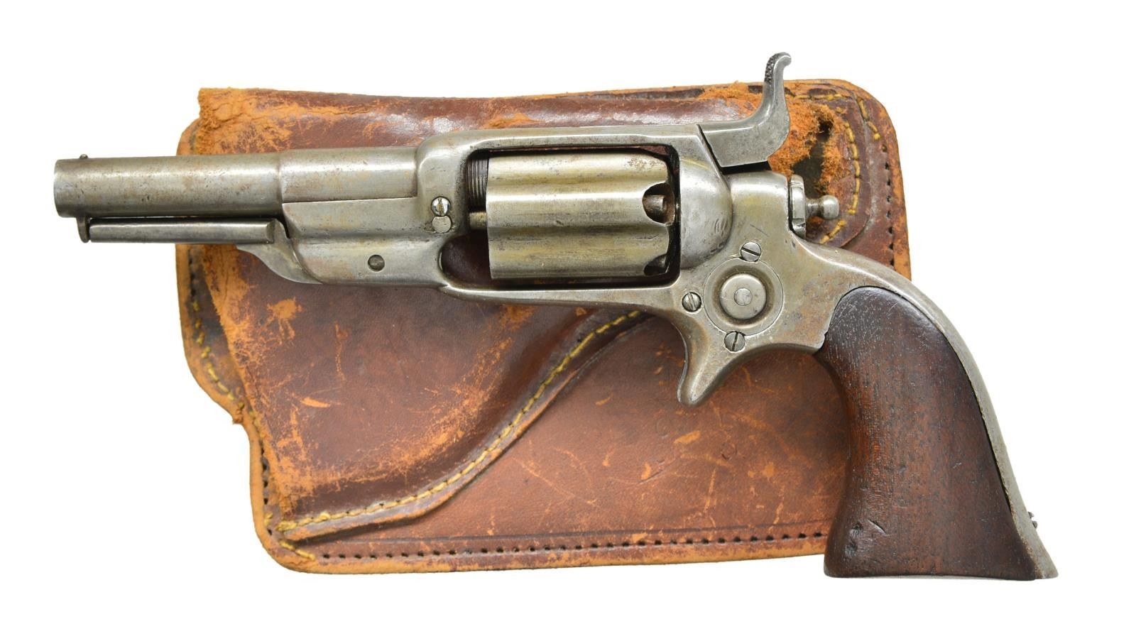 REVOLVER. Cal. 31. S# 7649. Bbl. 3 1/2" w/ brass bead & 2 line New York address. Model 5 w/ full fluted 5 shot cyl. Spur trigger. 1 Piece walnut grip. Approx 40,000 mfg. 1855-1870. UNATTACHED ACCESSORIES: leather holster marked "221/32 / V. L. & S. / Chicago". CONDITION: cleaned metal has gray appearance from touchup finish. Grips have age darkened worn appearance showing dents & handling marks. Action shows wear. Bore retains sound rifling shows spots of very light pitting. PROVENANCE: Collection of John Montague. (01-20786/DS). ANTIQUE. $400-600.