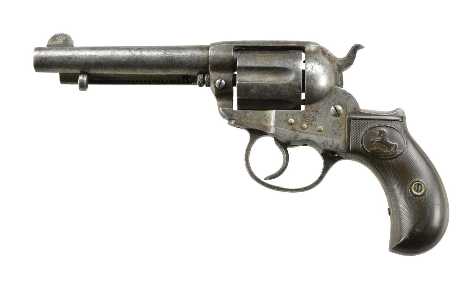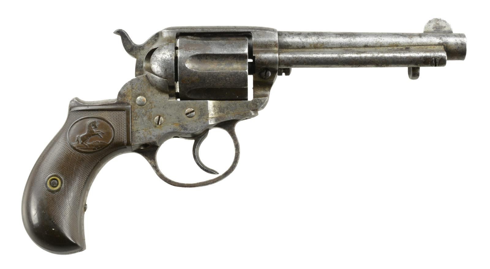 Cal. 41 Colt. S# 130306. Bbl. 4 1/2" w/ half moon front sight blade & fame notched rear. Mfg. beginning of 1902 (1877-1909) in largest Model 1877 caliber; Rainmaker in 32 Colt & Lightning in 38 Colt. Double action w/ bird's head grip having checkered hard rubber grips. Matching numbered cyl., trigger guard & back strap. Loading gate w/ 131 assembly number. Billy the Kid was known to have carried a Thunderer. CONDITION: fair appearance w/ patina throughout. Well worn grips w/out breaks. Cleaned previous oxidation. Good mostly bright bore w/ spots of pitting. Proper functioning but out of time. PROVENANCE: Estate Collection of Jack Verret Sr. (22-874/NW). CURIO. $350-500.
