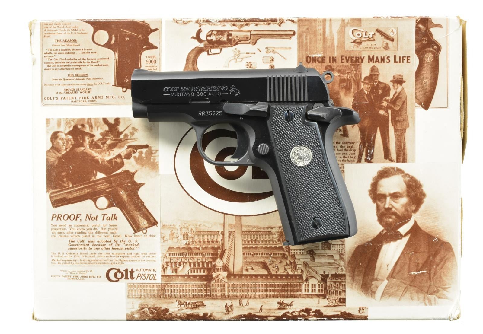 Cal. 380 ACP. S# RR32225. Bbl. 2 3/4". Ramp front sight w/ square notch rear sight. Blue finish. Checkered composition grips w/ Rampant Colt medallions. Mark IV Series 80, 1992 mfg. MAGS: 2 - 7 rd. UNATTACHED ACCESSORIES: blue molded box w/ properly labeled & numbered sleeve. Box contains owner's manual, hang tag, purchaser's card, the Colt Companion brochure, repair station pamphlet & Congratulations letter. CONDITION: retains over 99% original finish. Bright bore w/ sharp rifling. (20-2411/DS). MODERN. $700-1,000.