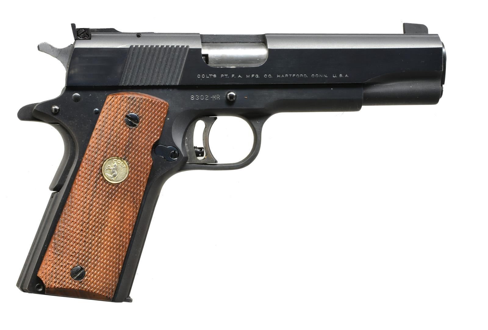 Cal. 38 Spl. Mid-range. S# 8302-MR. Bbl. 5". Patridge front sight w/ Elliason adj. rear sight. Adj. trigger w/ over travel stop. Blue finish. 2 Piece checkered walnut grips w/ Rampant Colt medallions. 1971 Mfg. MAGS: 3 detachable 8 rd. CONDITION: over 95% blue showing spots of freckling on right side of frame w/ scattered sm. handling marks. Very good grips. Near excellent bore. (20-3188/DS). CURIO. $1,800-2,500.