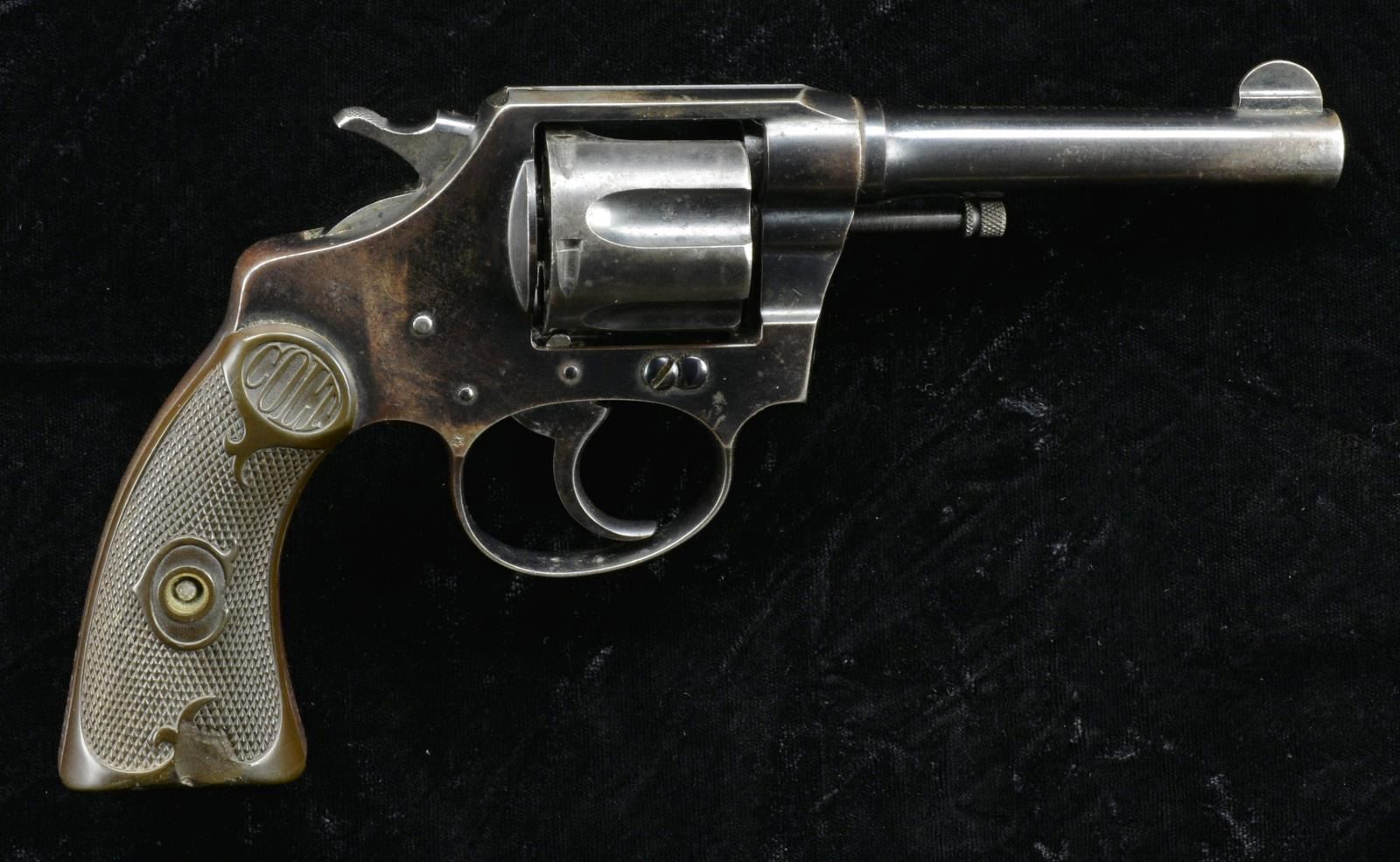 REVOLVER. Cal. 38 (38 S&W or 38 Colt New Police). S# 137134 (1928). Bbl. 4" w/ half moon front sight. Blue finish w/ 6 shot fluted swing out cyl. Checkered hammer spur. 2 Piece "COLT" hard rubber grips. Right side of trigger guard has star marking indicating possible factory repair. Butt of frame has partially obliterated "S 1958" & back strap has "381", possible police rack number. CONDITION: good overall w/ blue fading to brown w/ moderate marks, areas of finish loss, peppery oxidation. Top of hammer has noticeably more polished blue. Grips have noticeable gouges & chips. Very good bore. (22-2052/MD). CURIO. $250-400.