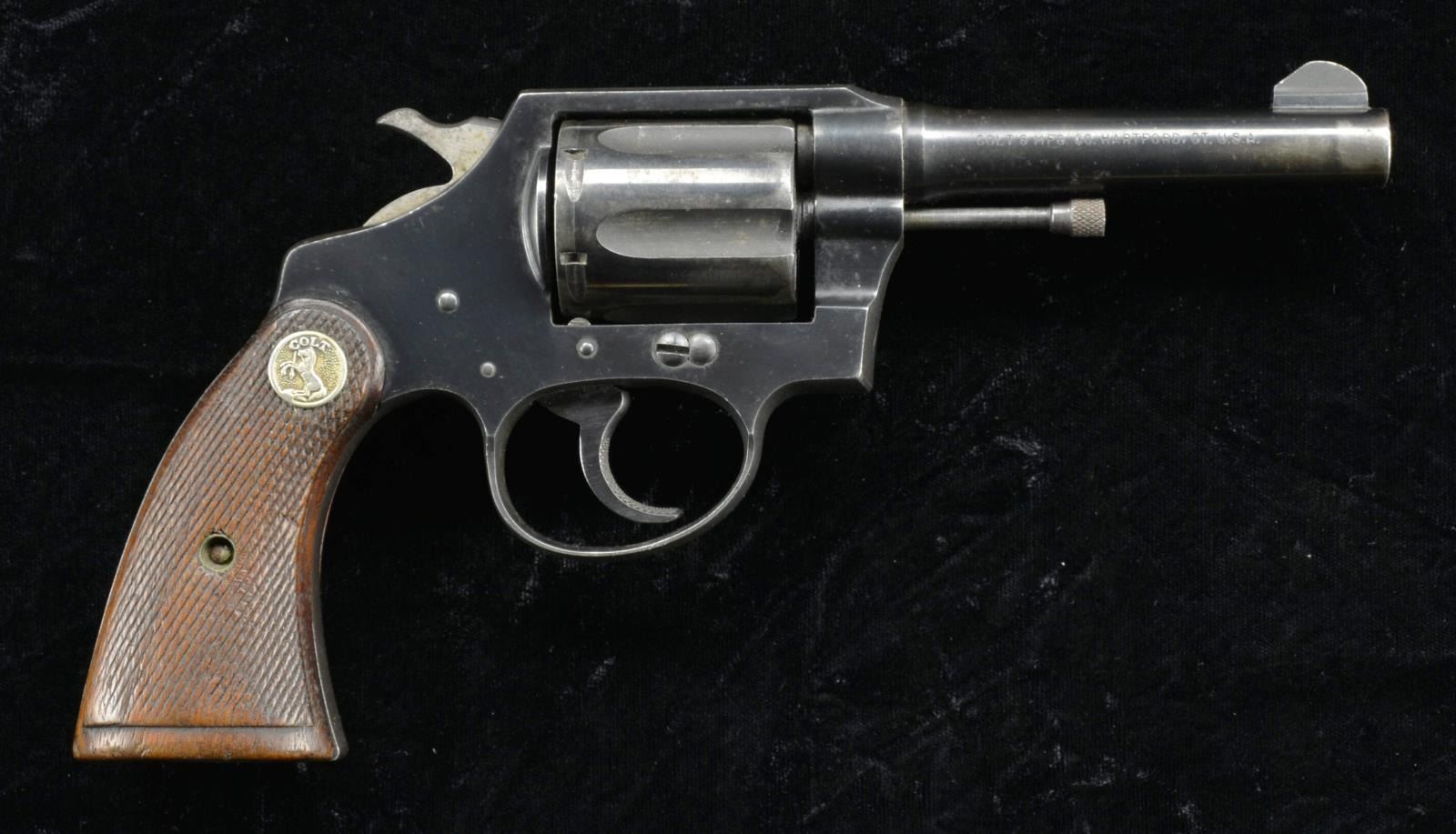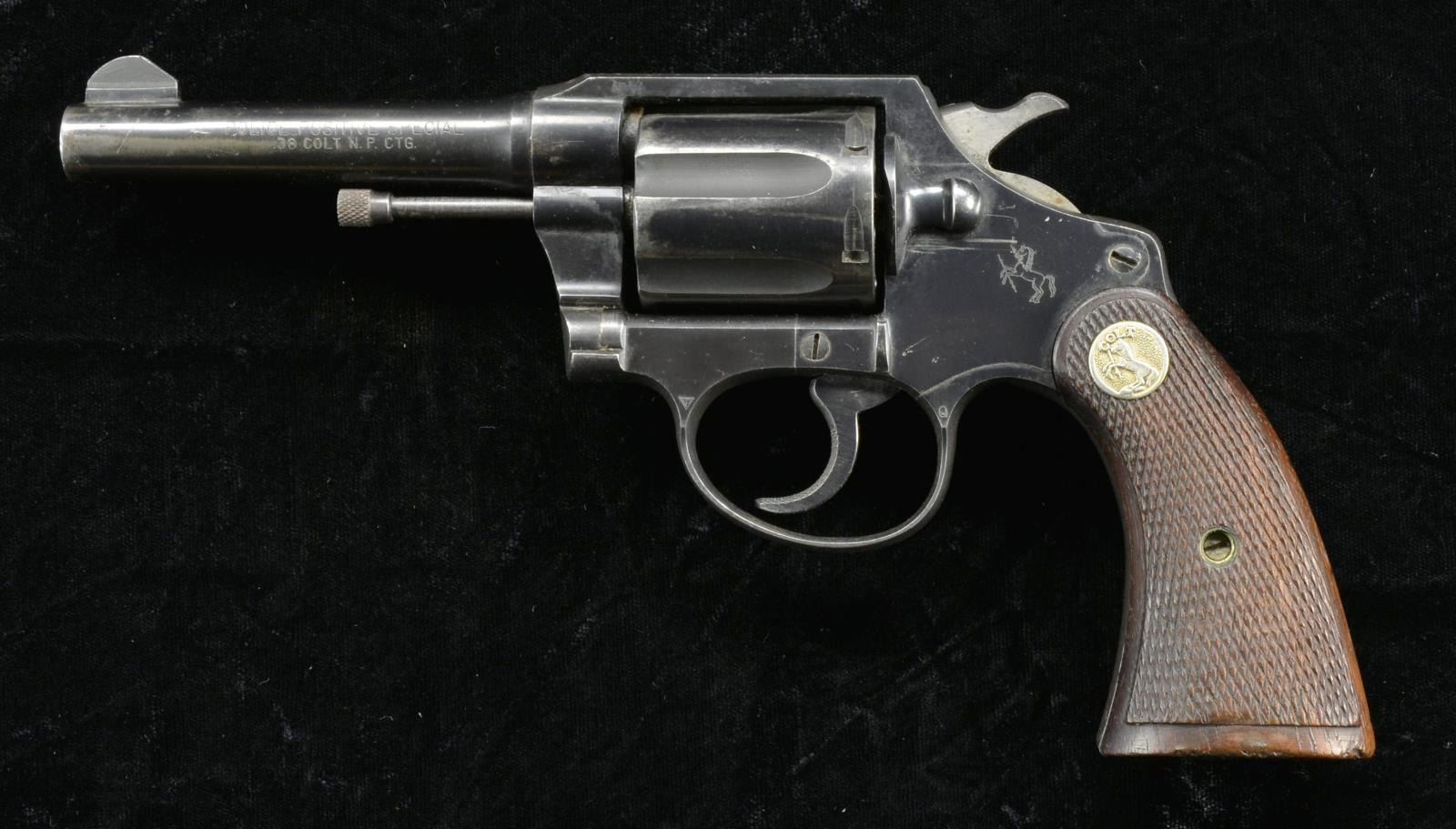 Cal. 38 Colt NP. S# 498842 (1948). Bbl. 4" w/ serrated ramp front sight. Polished blue finish on sides & matte blue finish on top & bottom surfaces. 6 Shot fluted swing out cyl. Serrated top strap. Checkered trigger & hammer spur. 2 Piece checkered walnut grips w/ Colt medallions. CONDITION: good overall appearance w/ moderate marks, areas of finish loss & peppery oxidation. Good lightly worn grips w/ light chips. Very good bore. (22-2050/MD). CURIO. $350-500.
