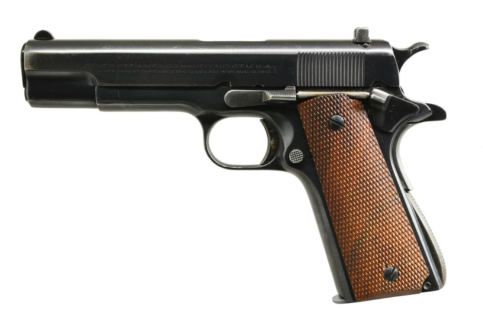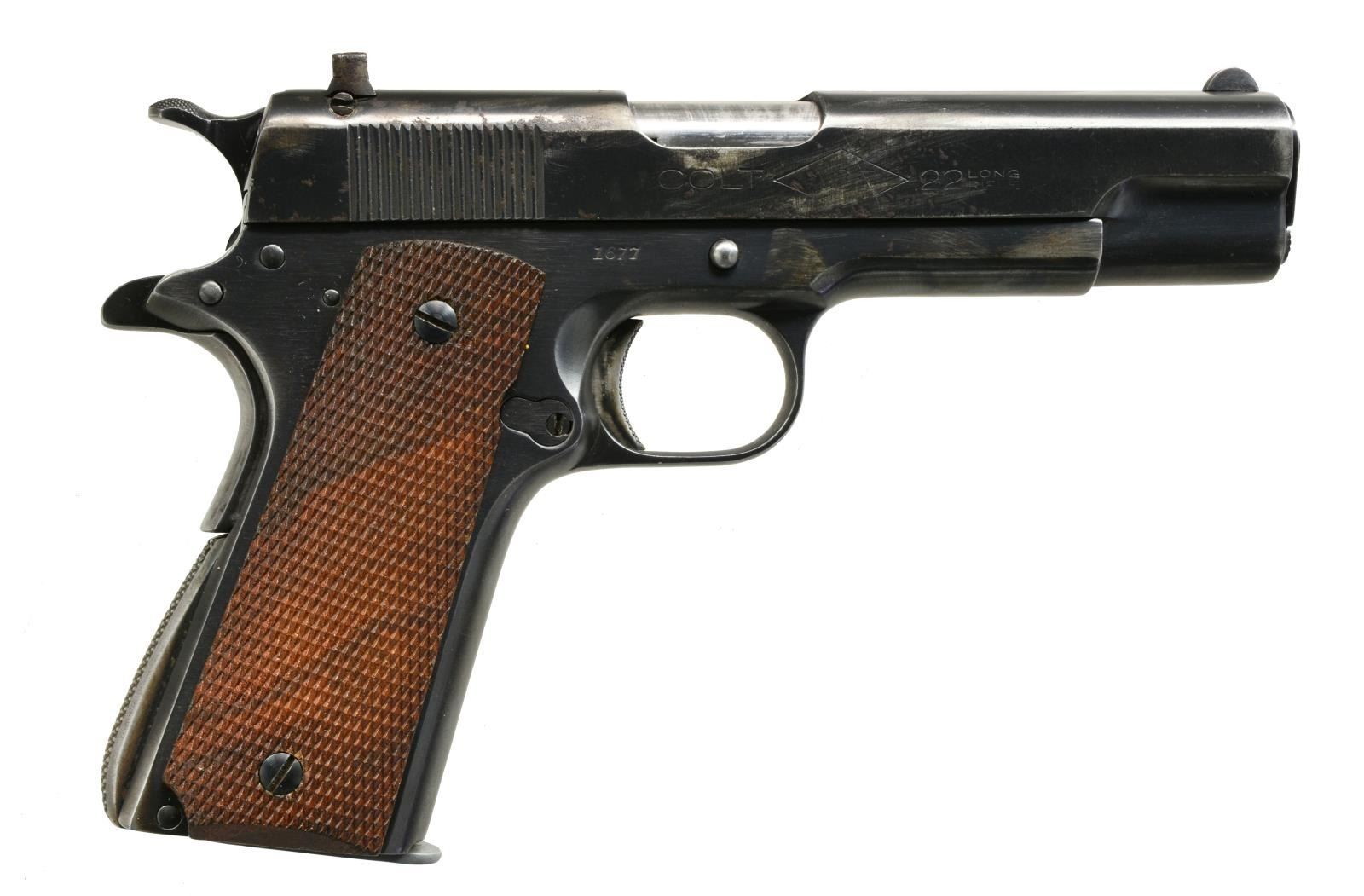 Cal. 22 LR. S# 1677. Bbl. 5". Mfg. 1931; first year of production. All correct metal features including stacked fiber washers on spring guide. Replacement full checkered walnut grips. MAGS: 1 factory 10 rd. w/ aluminum follower & very good body. Dull gray replacement aluminum base properly marked. CONDITION: good plus appearance as refinished w/ thinning of slide legend on left plus light oxidation & remainder of prior pitting on right side. Slight peppery prior pitting on upper right side of frame. Mainspring housing & grip safety w/ very little finish plus thinning on front strap. Very good grips w/ sm. mark by bottom left screw. Generally very good bore w/ occasional spot of cleaned pitting. (20-1842/NW). CURIO. $800-1,200.