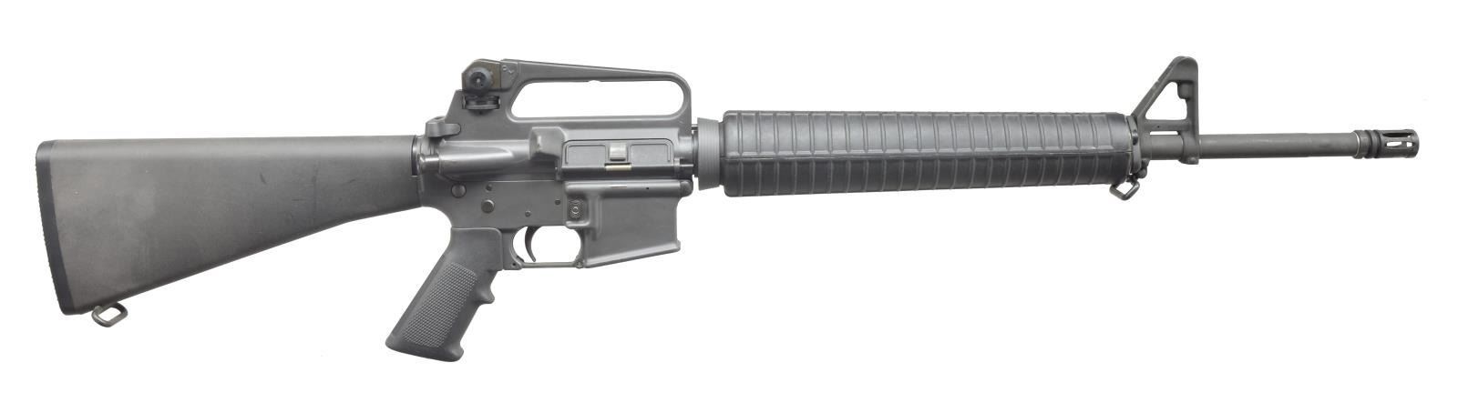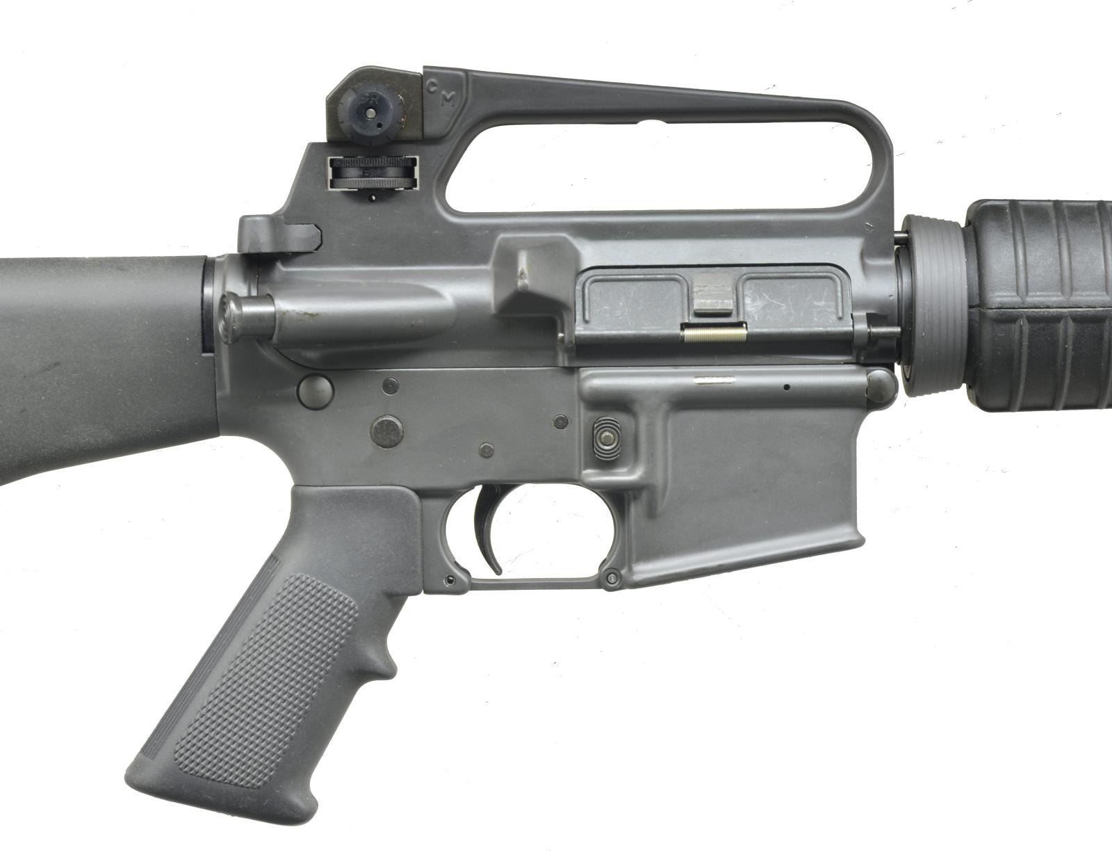 Cal. 223 Rem. S# MH066429. Model R6601. Bbl. 20" marked "CMP 5.56 NATO 1/7 HBAR". A2 Style flash hider. Elevation adj. traditional protected post front sight. Adj. dual aperture rear sight on upper receiver carry handle. Rnd. A2 style handguards w/ tapered delta ring. Slab side lower receiver w/ rnd. forward assist & brass deflector. 10 1/2" A2 trapdoor rear stock. Bottom front & rear sling swivels. Parkerized finish. MAGS: 2 Colt marked 20 rd. UNATTACHED ACCESSORIES: original blue label box containing instruction manual, web sling, & cleaning brushes. CONDITION: near excellent retaining over 99% finish. Bright near excellent bore. (20-2415/DS). MODERN. $1,500-2,000.