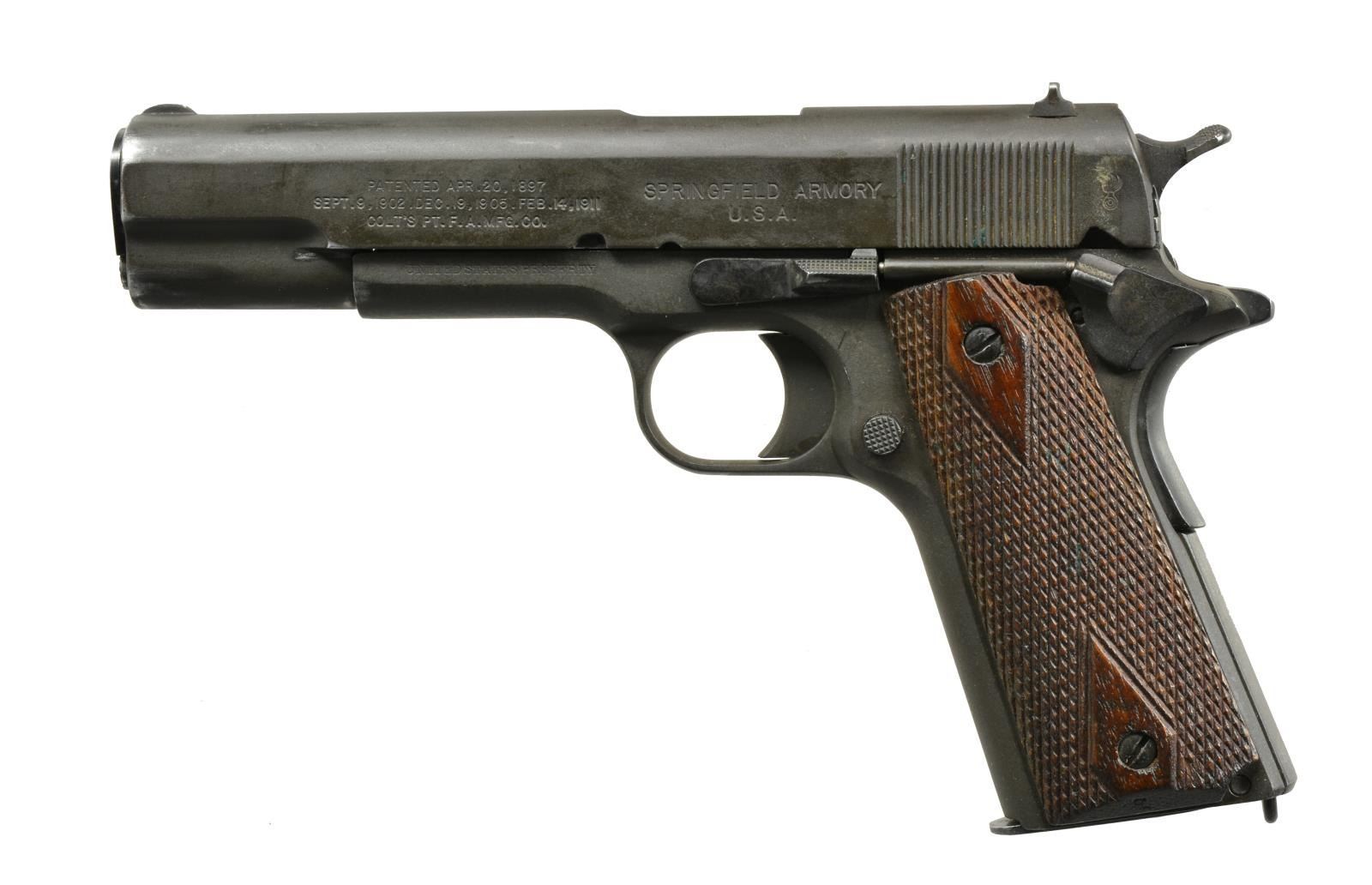 Cal. 45 ACP. S# 66973. Bbl. 5". Colt frame mfg. 1914 for US Army; 12,170 units. Late checkered safety tab w/out undercut. Correct checkered slide stop w/ undercut. "H" provisional mark by disconnector along w/ "R". Very faint property mark & non visible inspector mark. Correct dbl. diamond checkered walnut grips. Springfield Armory slide w/out eagle on right side near cocking grooves. Colt Type 5 bbl. as used from 1918-1924. MAGS: 1 very good to excellent Ridson two toned 7 rd. CONDITION: good plus overall appearance as reparkerized; no arsenal rebuild mark. Function wear on front of slide along w/ thinning at muzzle. Overall somewhat spotty appearance of parkerizing most noticeable on slide. Light scratches from improper slide stop installation. Sear pivot pin installed backwards. Good to very good grips. Loose link pin. Generally good bore w/ light frosting. (20-1823/NW). CURIO. $800-1,200.