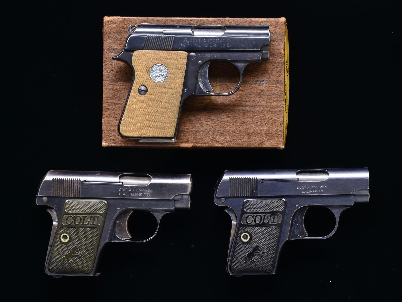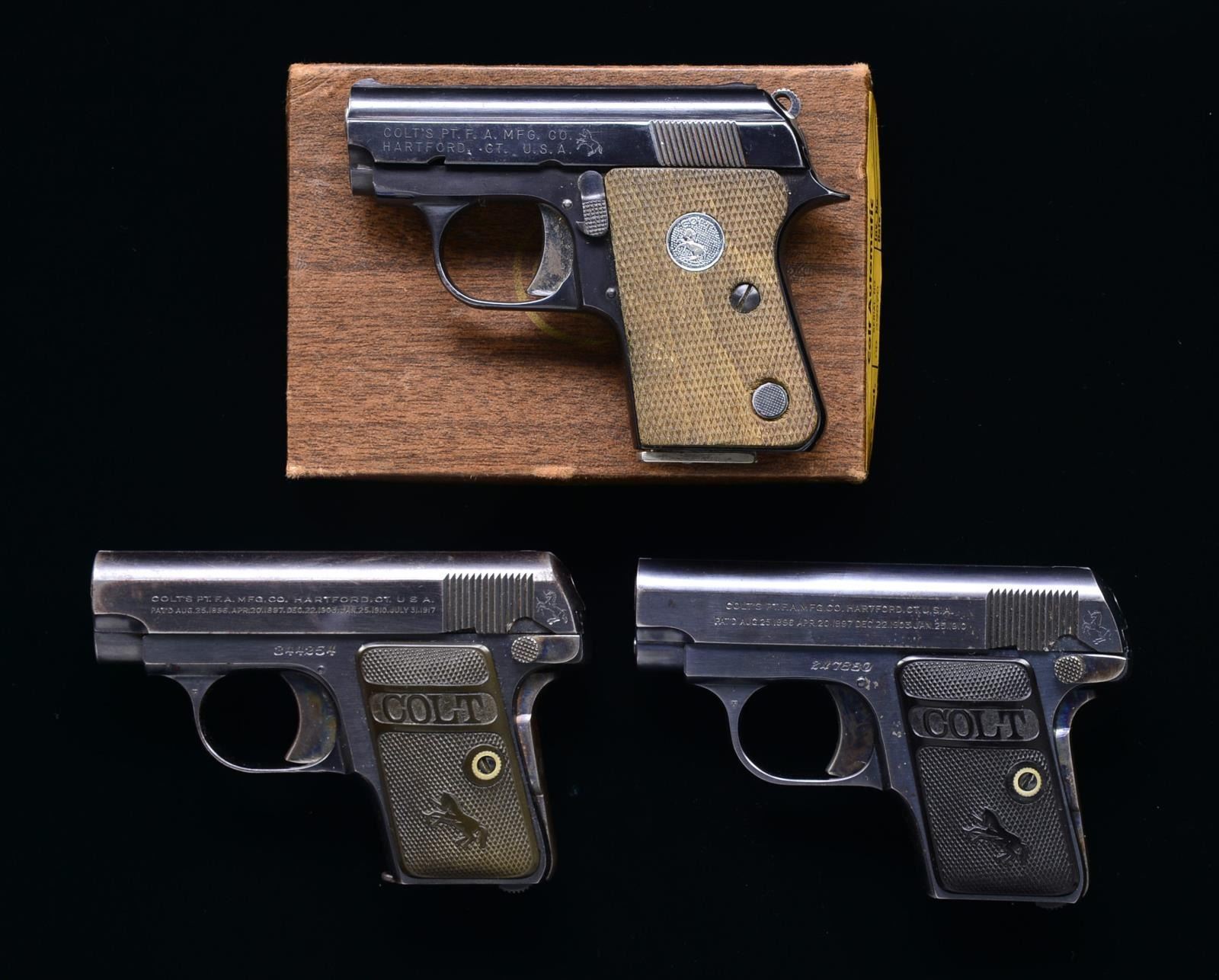 ALL: cal. 25 ACP. 1) 1908 VEST POCKET. S# 247880. Bbl. 2". Blue finish w/ case colored trigger & grip safety. 2 Piece checkered hard rubber Rampant Colt grips. 1920 Mfg. MAGS: 2 detachable 2 tone Colt marked 6 rd. CONDITION: 90% blue showing edge wear & sm. spots of freckling. Bore retains strong rifling showing sm. spots of pitting. (20-2325/DS). CURIO. 2) 1908 VEST POCKET. S# 344254. Bbl. 2". Blue finish w/ case colored trigger & grip safety. 2 Piece checkered hard rubber Rampant Colt grips. MAGS: 2 detachable 6 rd. CONDITION: 70% lightly worn blue showing edge wear & spots of corrosion & light pitting. Grips show moderate wear. Bore has slightly darkened appearance w/ lightly worn rifling. (20-2326/DS). CURIO. 3) COLT JUNIOR. S# OD29488. Bbl. 2 1/4". Blade front sight w/ square notch rear sight. Blue finished w/ bright trigger & hammer. 2 Piece checkered walnut grips w/ silver Rampant Colt medallions. 1971 Mfg., in Spain by Astra. MAGS: 1 detachable 6 rd. UNATTACHED ACCESSORIES: 2 piece box w/ wood grain lid having proper label w/ mismatched S#. Box contains instruction manual & display card. CONDITION: over 90% blue showing edge wear w/ scattered spots of freckling. Grips show moderate wear. Bright bore w/ strong rifling. PROVENANCE: The Estate of Richard Willman. (20-2327/DS). MODERN. $900-1,300.