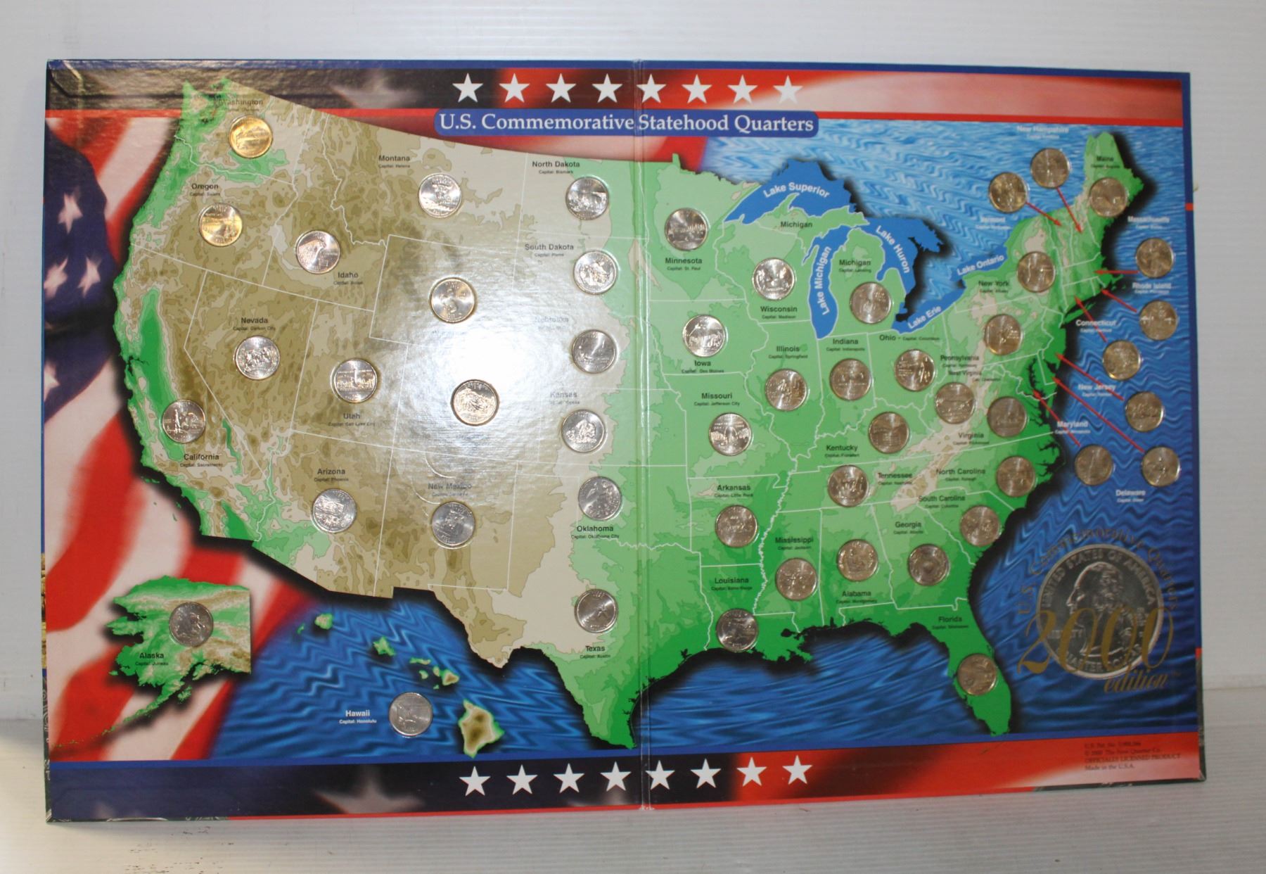 LARGE DISPLAY MAP OF THE USA WITH COMPLETE SET OF 50 STATE QUARTERS.