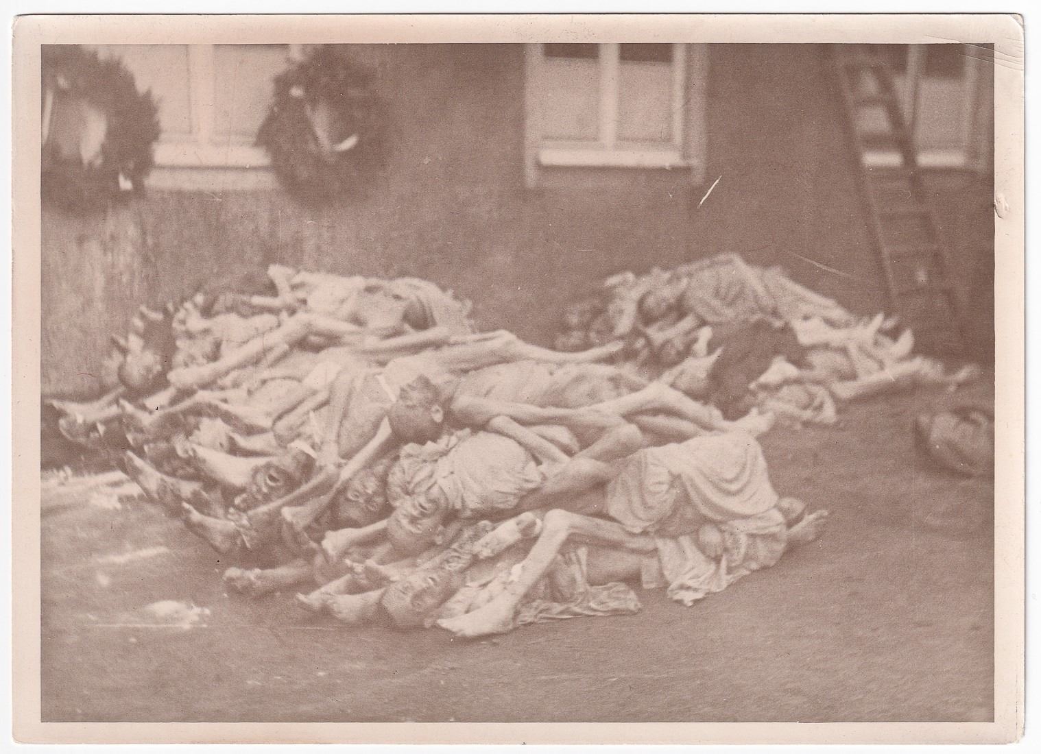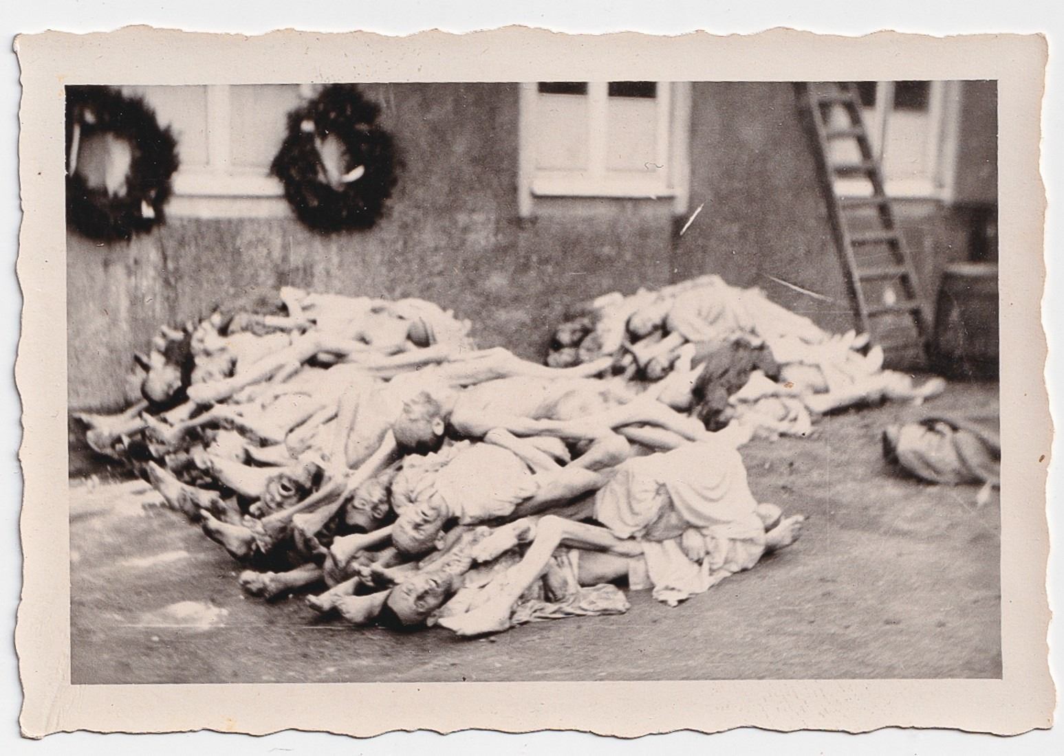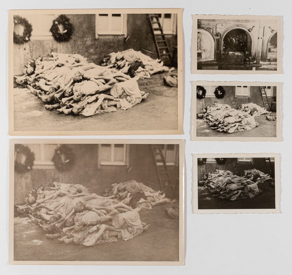 Lot of five photos taken of a concentration camp. The photos are all candid shots by an American soldier who visited the site and show a pile of bodies and a crematorium. The concentration camp is unknown but American soldiers gave the deceased a funeral, as can be seen with the wreathes in the background of some of the photos. Two photographs are 7 x 5 inches. Three photographs are 2.5 x 3.5 inches.