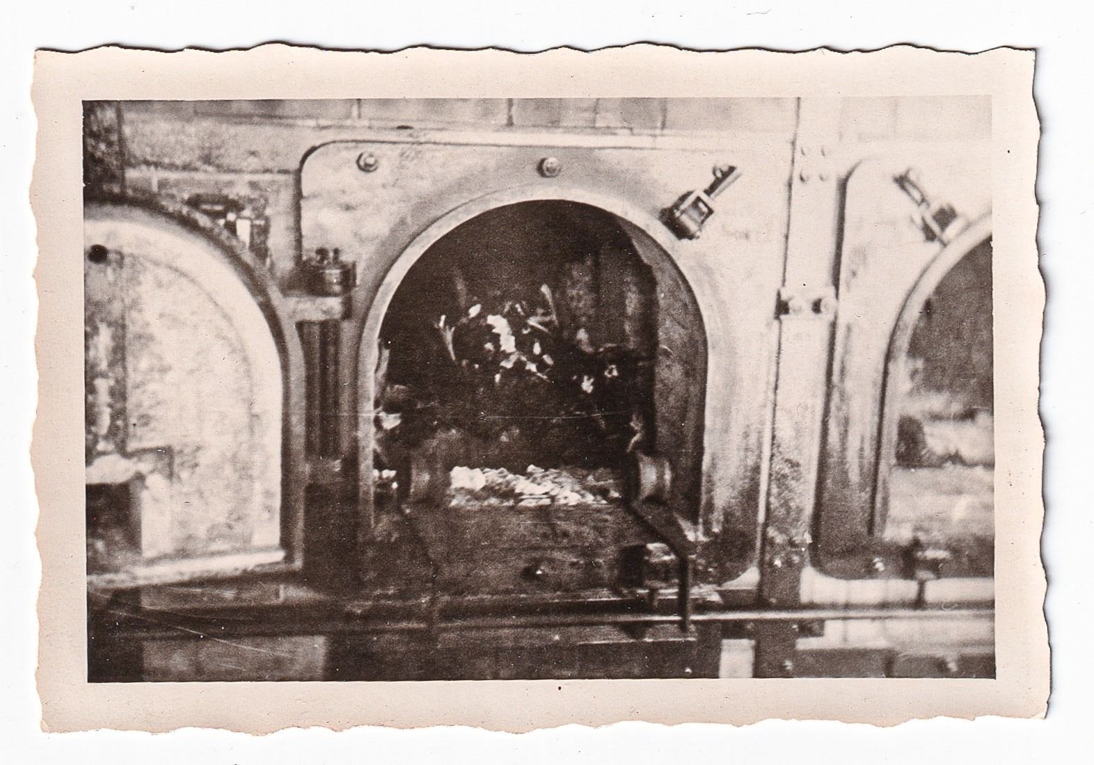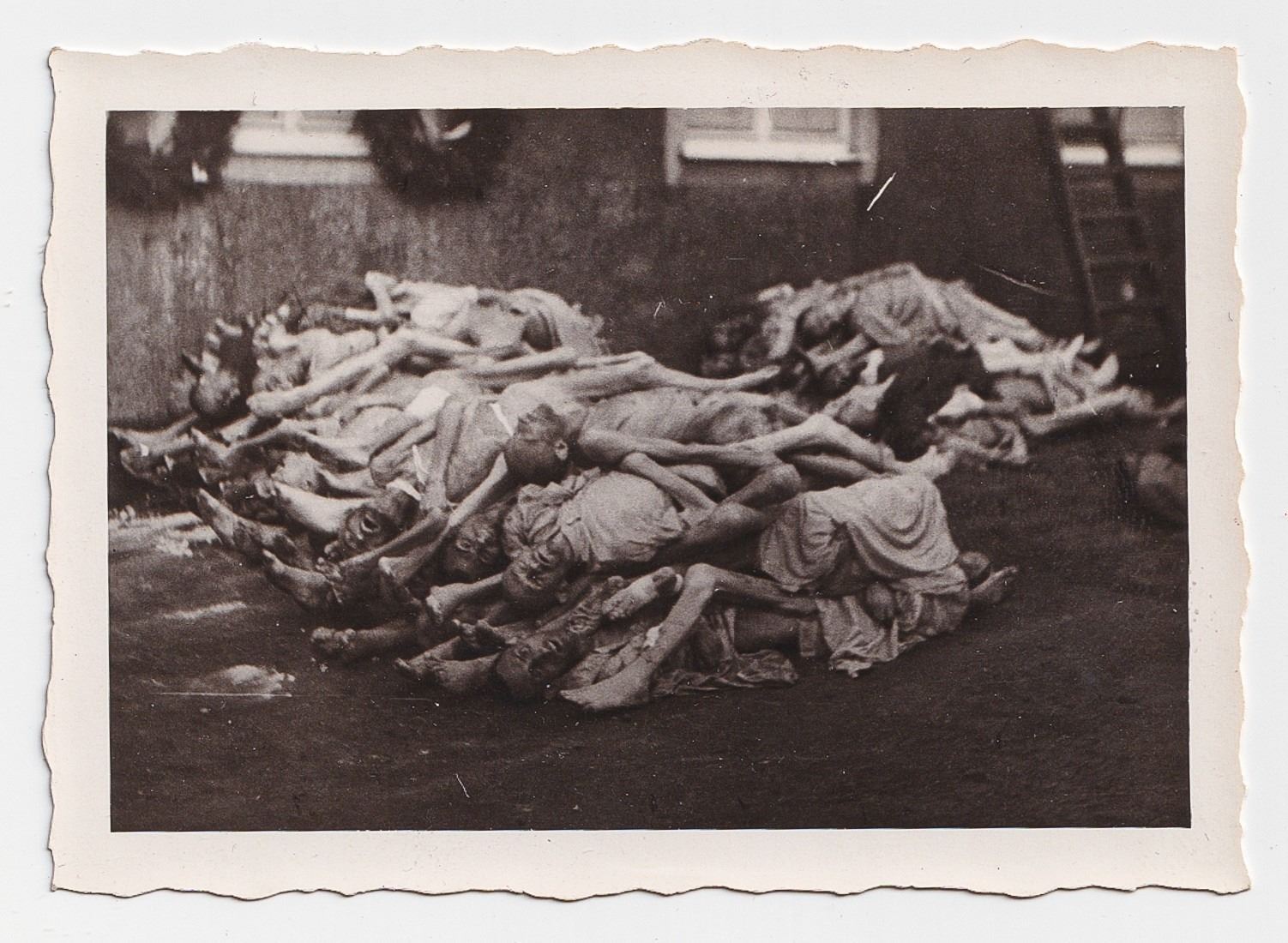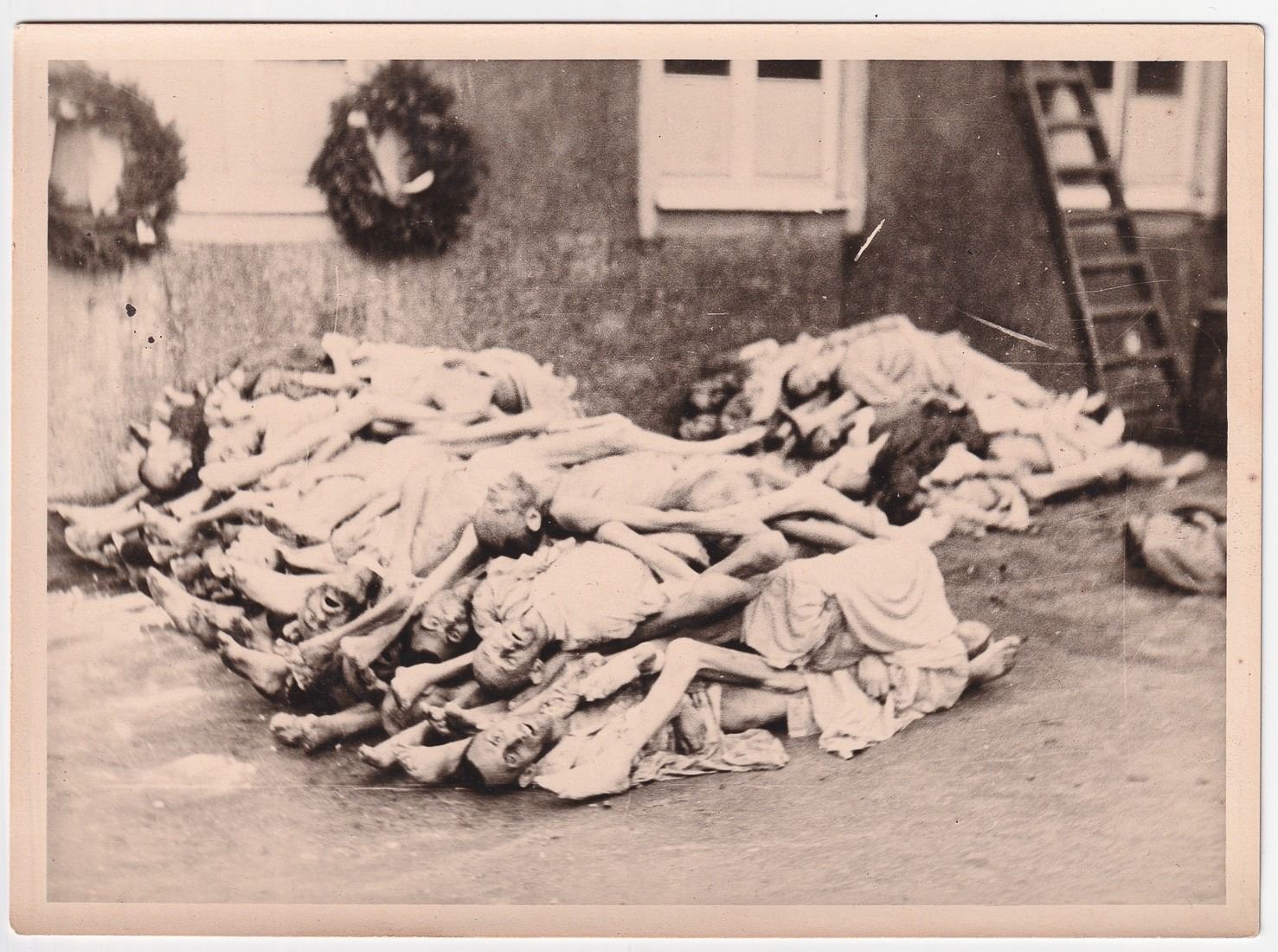 Lot of five photos taken of a concentration camp. The photos are all candid shots by an American soldier who visited the site and show a pile of bodies and a crematorium. The concentration camp is unknown but American soldiers gave the deceased a funeral, as can be seen with the wreathes in the background of some of the photos. Two photographs are 7 x 5 inches. Three photographs are 2.5 x 3.5 inches.