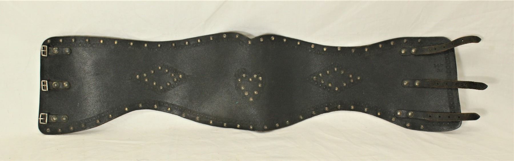 Scalloped CP Shipley marked bronc belt with studded perimeter, hearts, and diamonds.