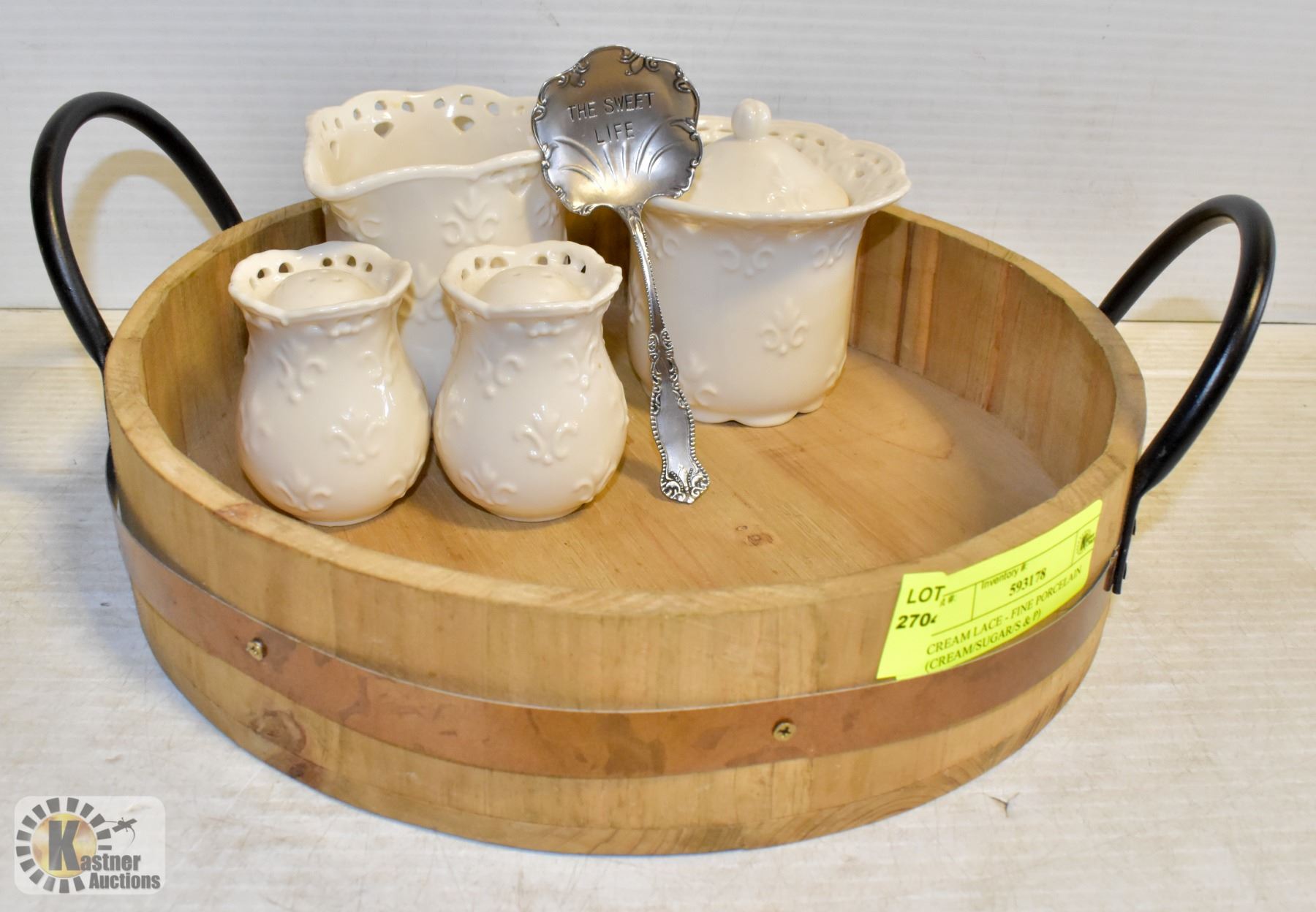 CREAM COLOR, SALT/PEPPER, SUGAR WITH LID/CREAM, CIRCULAR WOOD TRAY