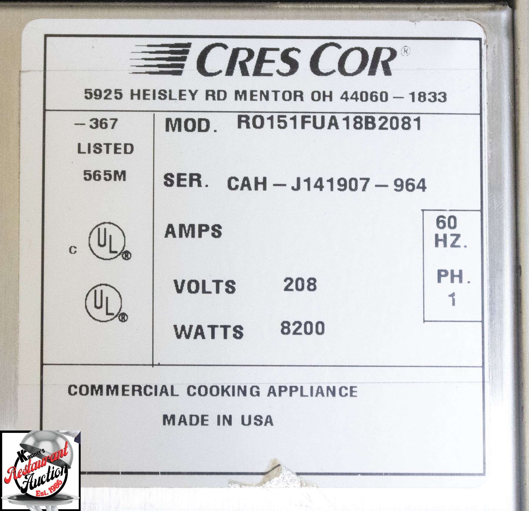 MODEL # R0151FUA18B2081, 60 HZ, PHASE 1, 208 VOLTS, 8200 WATTS, 32" X 28" X 74" * TESTED AND WORKING *