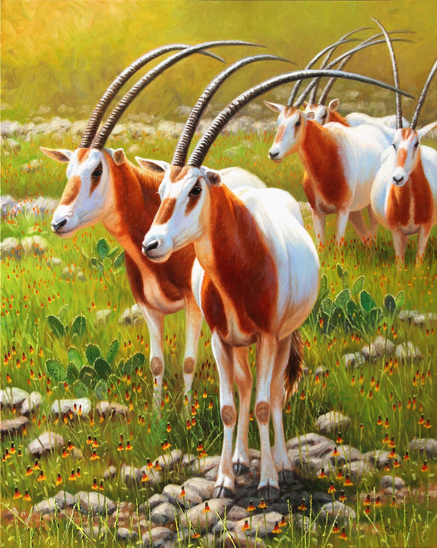 "Desert Dwellers" - Original oil painting by Cynthie Fisher, measures 22x28" framed. One of the most beautiful of desert antelope, the scimitar-horned oryx, are critically endangered in northern Africa, but they are thriving in the Texas Hill Country where Cynthie has studied, hunted and even kissed one! DALLAS SAFARI CLUB THANKS CYNTHIE'S WILDLIFE ORIGINALS FOR THIS 100% DONATION. Cynthie Fisher, 406-375-1445, 406-360-0131, 651 Bobcat Lane, Hamilton, MT 59840, cynthieart@gmail.com, CynthieFisher.Com, BOOTH #3728.
