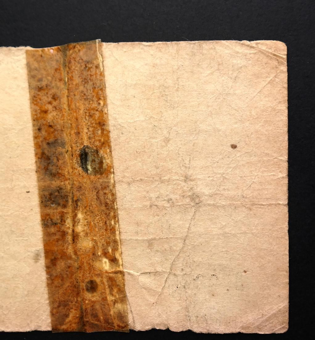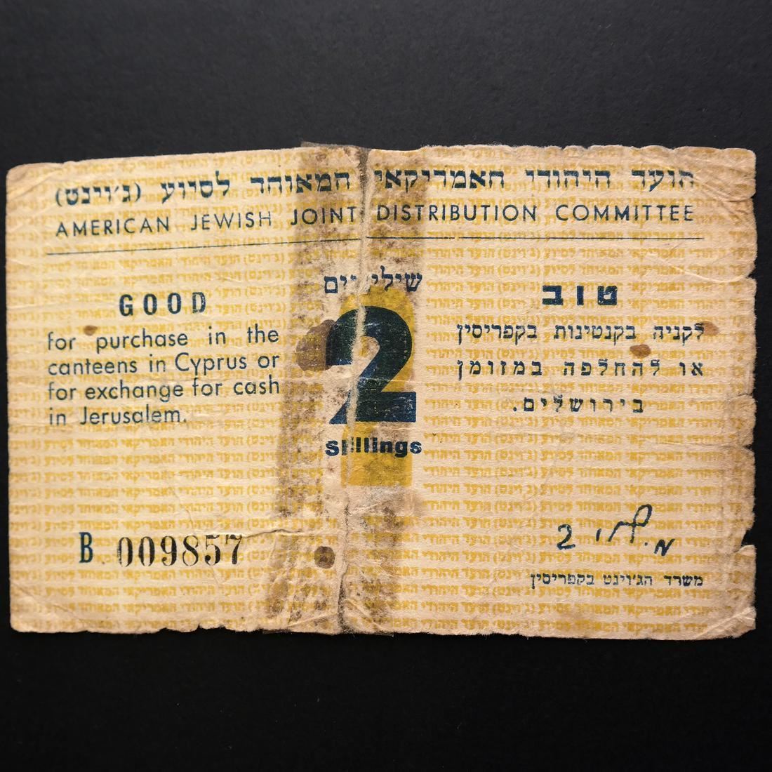 First issue, Good for purchase in the canteens in Cyprus or for exchange for cash in Jerusalem, serial #009857, folds, creases, edge tears and soiling, complete vertical center tear tape reinforced and stained, Good.