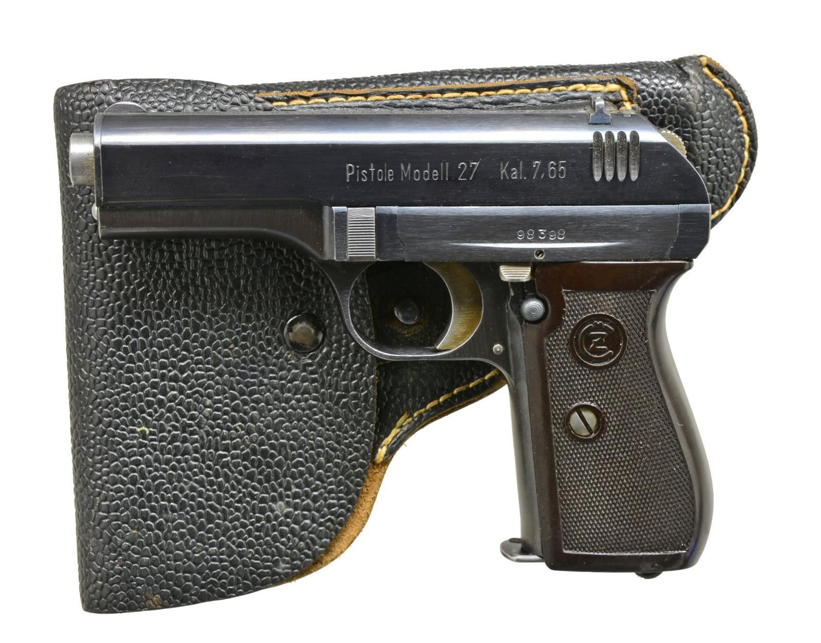 VARIATION SEMI AUTO PISTOL & HOLSTER. Cal. 7.65mm. S# 98398. Bbl. 3 3/4”. “WaA76” proofed frame & slide. 4 Groove vertical slide serration w/ high polish blue & strawed sm. parts. “BOHMISCHE WAFFENFABRIK A.G. IN PRAG” marked slide. Matching numbers. The Bohmische slide legend was adopted during 1941 after military production had started for the German forces. 1 Piece brown plastic grips w/ CZ logo. MAGS: 1-8 rd. marked “P.MOD 27” on base plate. UNATTACHED ACCESSORIES: unmarked black pebble grain holster. CONDITION: overall very fine w/ minor high edge wear & a few faint handling marks. Crisp markings. Very good grips w/ only a few minor light handling marks. Good strawed parts w/ light wear from use. Near excellent bright bore w/ strong rifling. Very good holster showing light wear. (20-3331/ZAL). CURIO. $400-600.