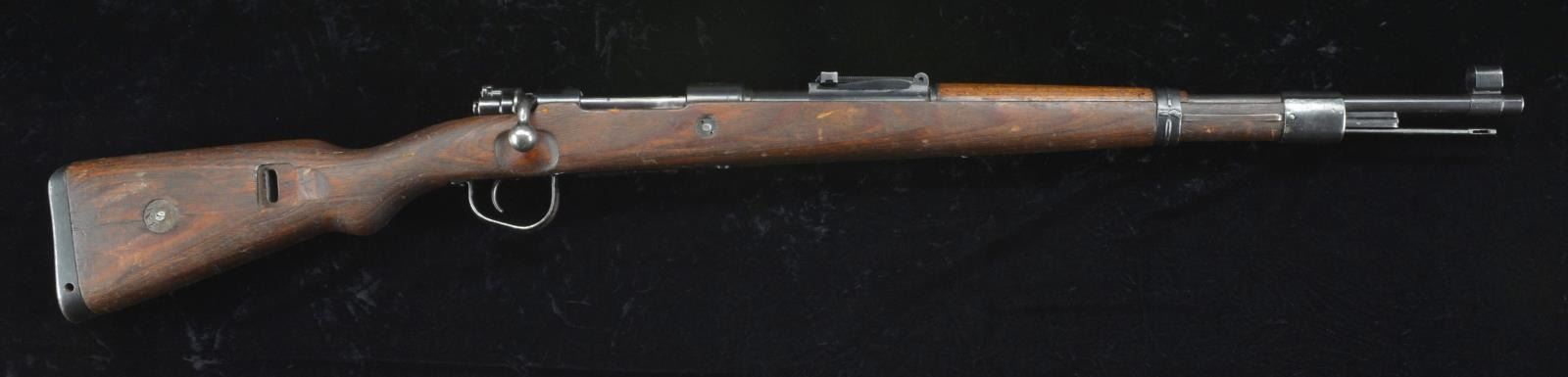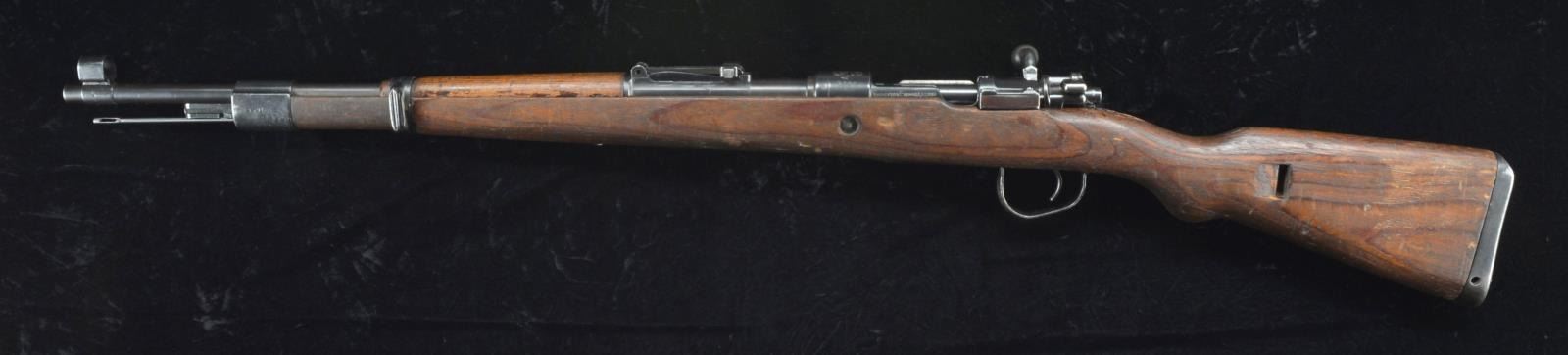 MILITARY RIFLE. Cal. 8mm Mauser. S# 5930 L. Bbl. 23 5/8". Non matching numbers throughout. Import marked on bottom of bbl. Receiver ring is marked on top w/ crisp Czech rampant lion crest as additional triangular Iraqi marking resembling an inverted "2" which also appears on top of bbl. over chamber & in the sling mortice on the right side of the butt. Left receiver rail marked "CESKOSLOVENSKA ZBROJOVKA A.S. BRNO". Tangent rear sight graduated to 2,000 meters. Inverted V front sight w/ protective hood. Turned down bolt handle. Cleaning rod & bayonet bar are present. Milled solid type upper band. Stamped welded lower band. Bands are retained by single spring. Laminated M98K type stock set, w/ provision for German style side sling. Steel marking disk on right side of butt w/ Arabic numerals. Cup type buttplate w/ transverse disassembly hole. Unmarked stamped trigger guard w/ blind mag. & lg. bowl trigger guard. CONDITION: stock set has moderate wear, staining & handling marks throughout. Left side of buttstock has traces of white painted markings. Metal retains 75% original blue w/ thinning & light wear. Fair worn bore turning dark in grooves. (22-741/RW). CURIO. $300-500.