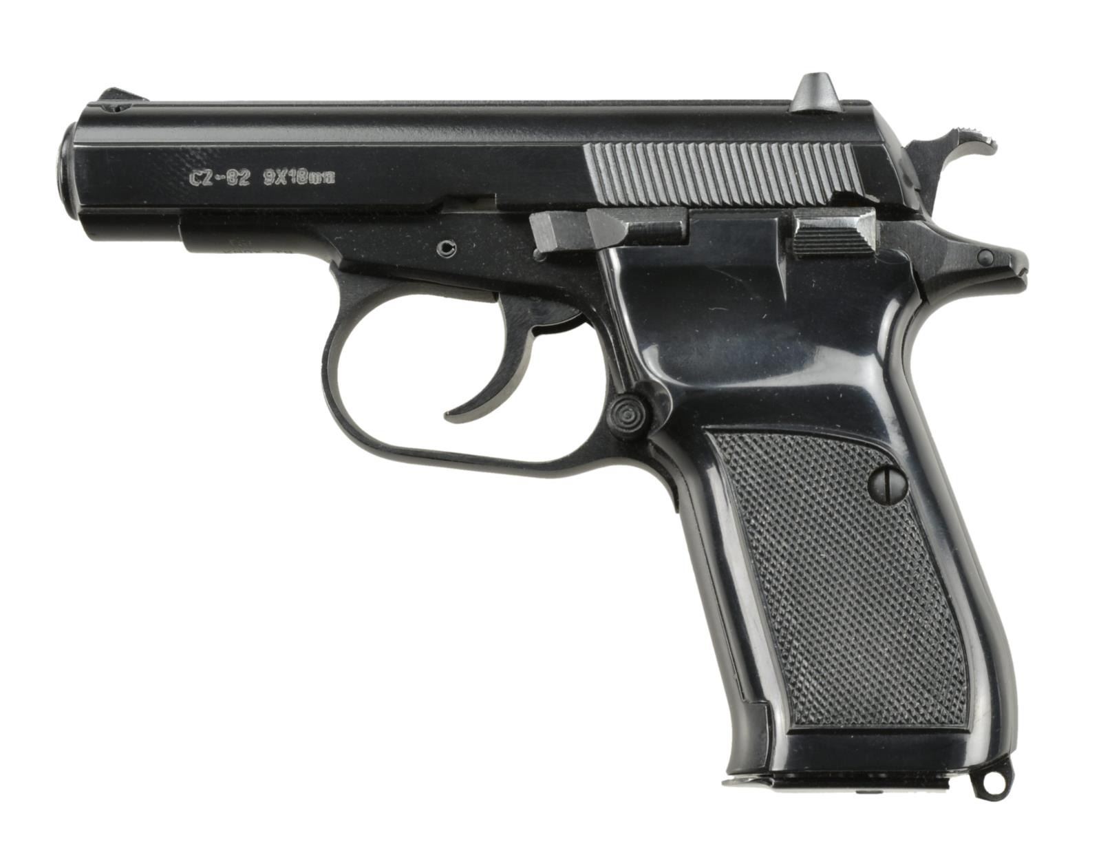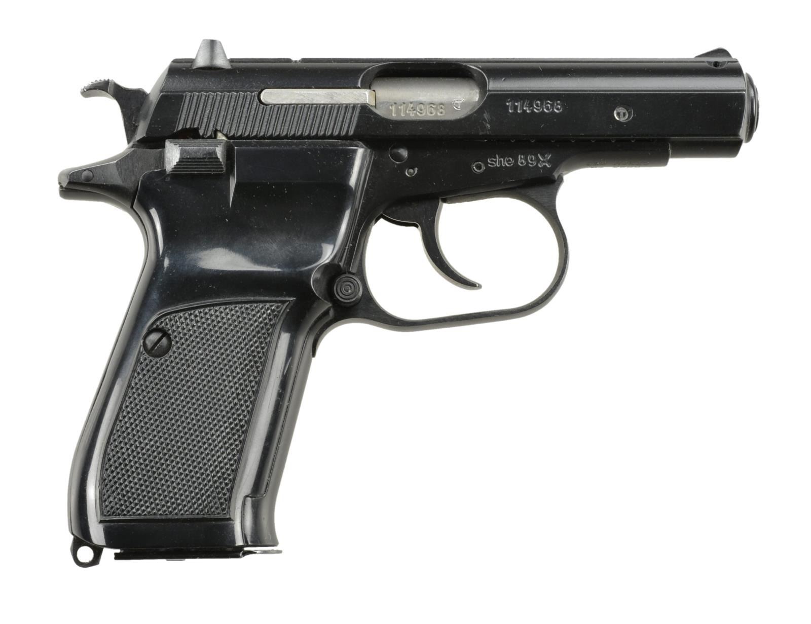 Cal. 9x18. S# 114968 (1989). Matching numbered slide & 3.8" bbl. w/ polygonal rifling. Blue finished pistol w/ fixed sights, ambidextrous safety, hinged trigger guard & lanyard loop at butt. Frame has TGI import mark & "she 89" stamp. 2 Piece black plastic grips. MAGS: 1 - 12 rd. CONDITION: near excellent overall w/ a few light marks. Very good polygonal bore. (22-770/MD). CURIO (Per BATFE list). $200-400.