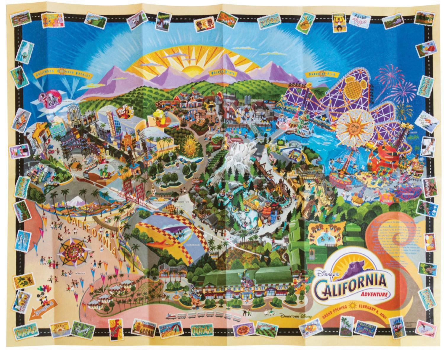 (California Adventure, 2001) A stylized map created to celebrate the Grand Opening of Disney's California Adventure on February 8, 2001. The opening year map features Park landmarks including Paradise Pier, Superstar Limo, and Muppet Vision 3-D, as well as Michael Eisner's opening dedication message at the bottom-right. The map measures 26.5"x34.25" and is in fine condition with minor wear to the original fold lines.