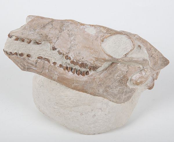 Camel Fossil Skull. Many strange and unusual mammals were found in western Nebraska and South Dakota 30-40 million years ago. Their rare and valuable fossils are sometimes found in the White River Badlands where they are uncovered by rain, wind and frost and are quickly destroyed unless they are found and collected. Poebrotherium was one of the very first camels over 30 million years old which originated in North America and not in Asia. It was the size of a sheep and lived in herds standing only about 30 inches tall. It had longer hind legs than forelegs and was built for speed. This virtually complete skull is 8 x 2.5 x 3.5 inches and is still positioned on the stone matrix as found in Sioux County Nebraska. The quality is outstanding with just the very front teeth restored. A rare and important fossil that is seldom found so complete.