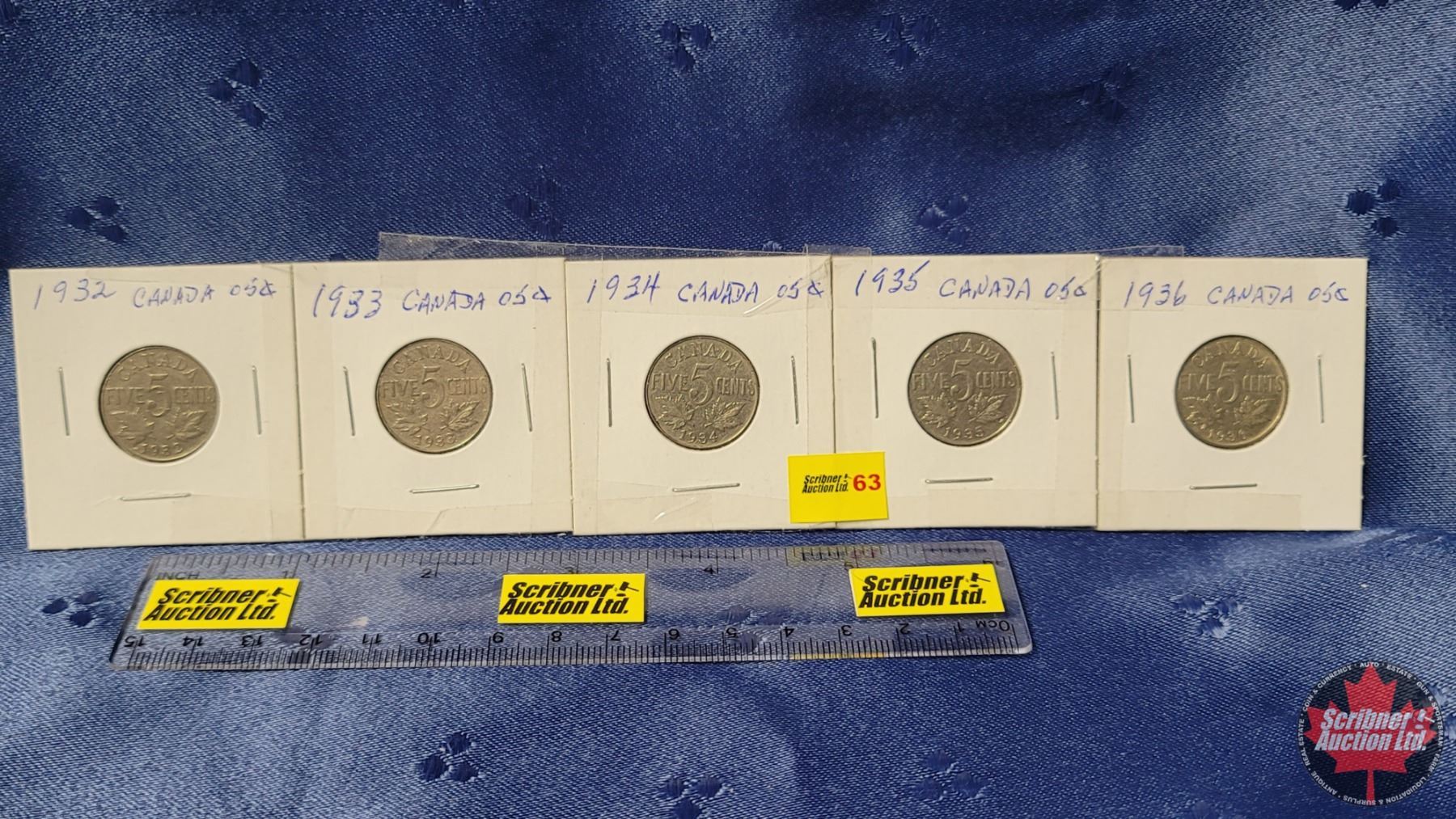 Canada Five Cent - Strip of 5: 1932; 1933; 1934; 1935; 1936