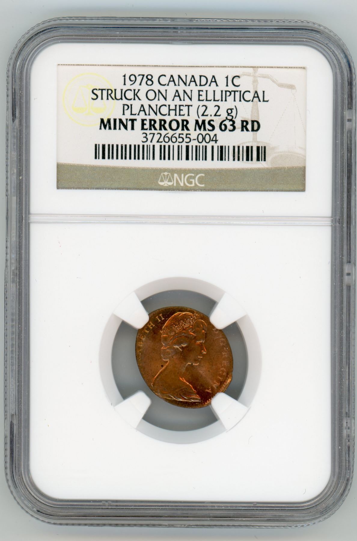 Error: 1978 1c struck on an elliptical planchet, 2.2 g, NGC MS-63 RD, neat error with lots of eye appeal