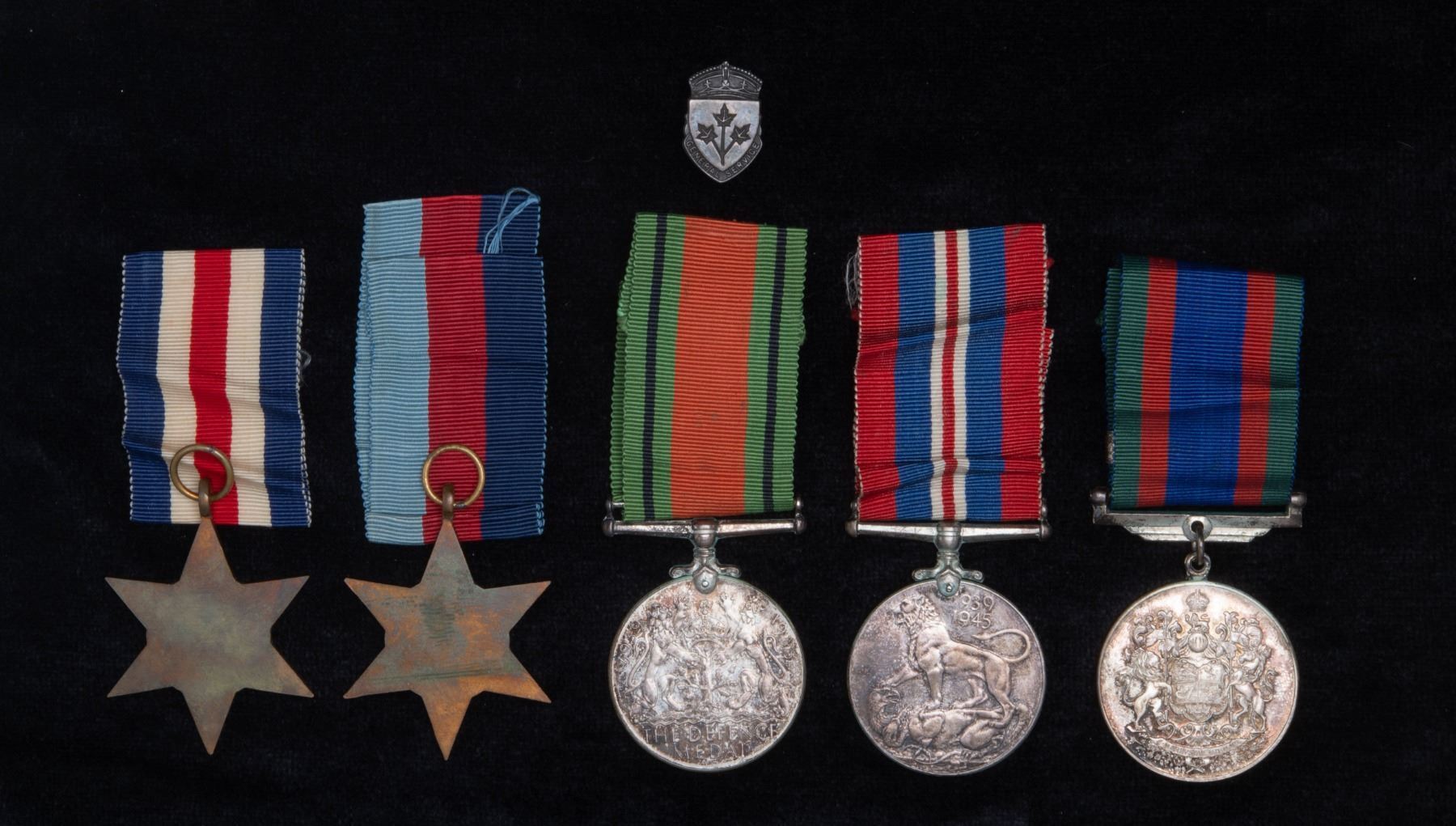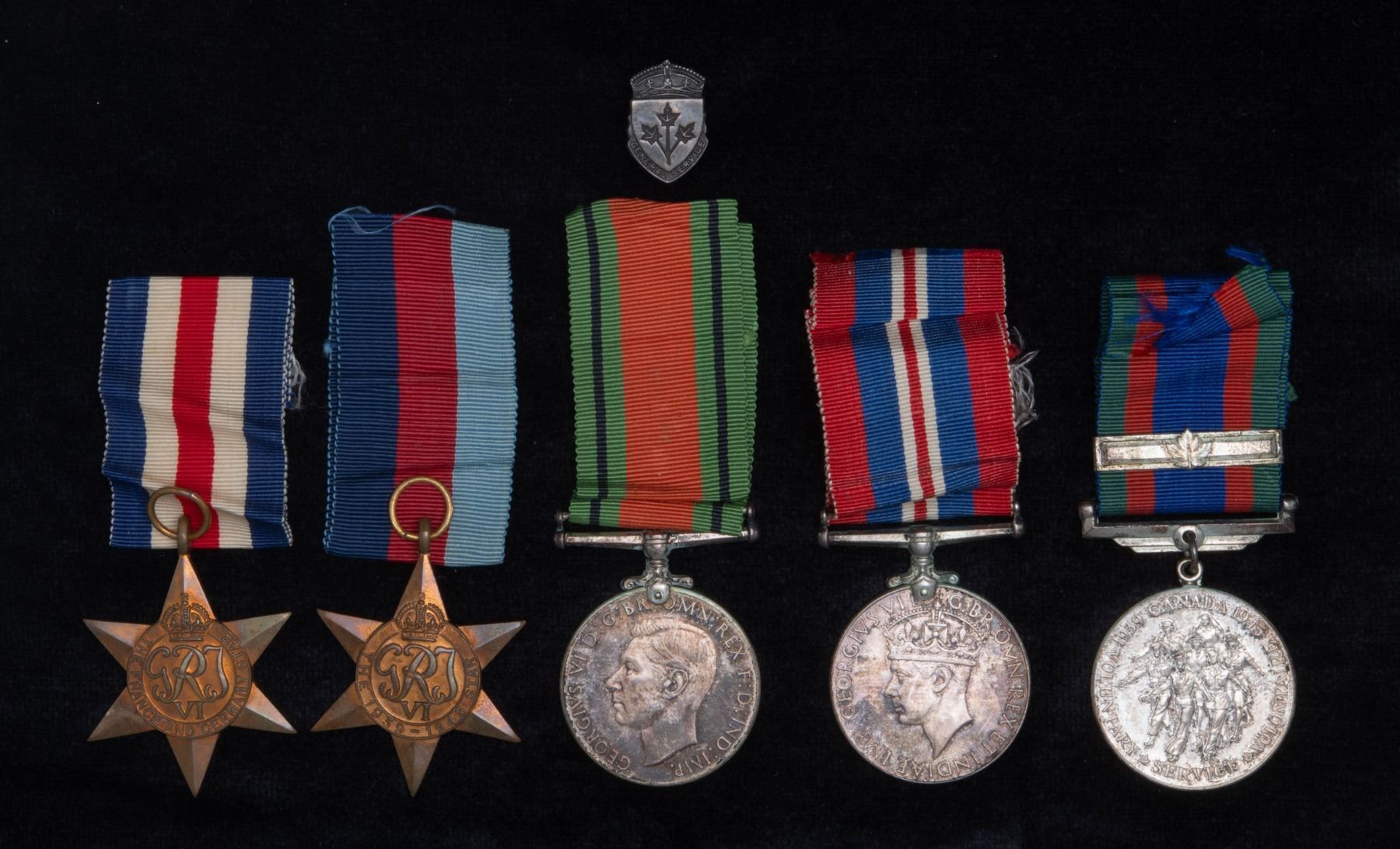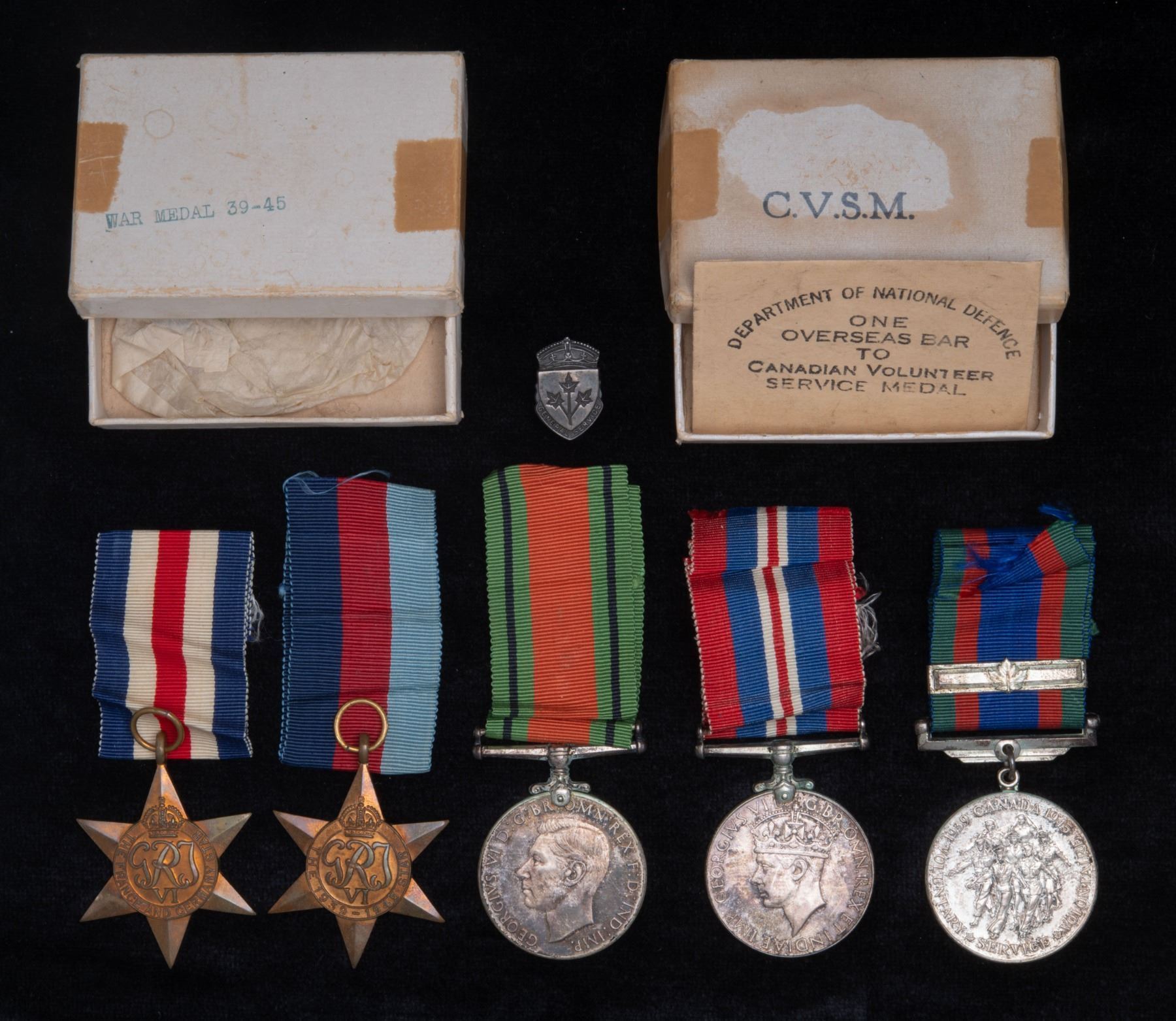 A WWII medal group, consisting of: 1939-1945 Star, France and Germany Star (both with ribbons), nicely-toned Defence and 1939-1945 Medals, Canadian Volunteer Service Medal with Clasp, together with a sterling Silver "For General Service" Pin. All housed together in two original white boxes. (Lot of 6 items)
