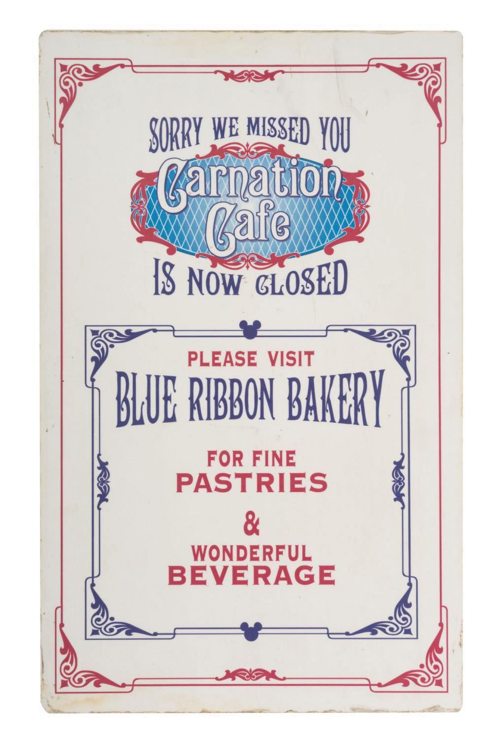 (Disneyland, c.1990s-2000s) A "Sorry We Missed You" sign from the Carnation Cafe. Upon closing for the day, this one-sided sign was placed within a holder on a stanchion at the Carnation Cafe to guide guests toward the Blue Ribbon Bakery by promoting the bakery's fine pastries and wonderful beverages. Measuring approximately 17.25"x 10.75", the acrylic sign is in very good Park-used condition with minor scratches and scuffs on both sides, and peeling to lamination and wear around the corners and edges.