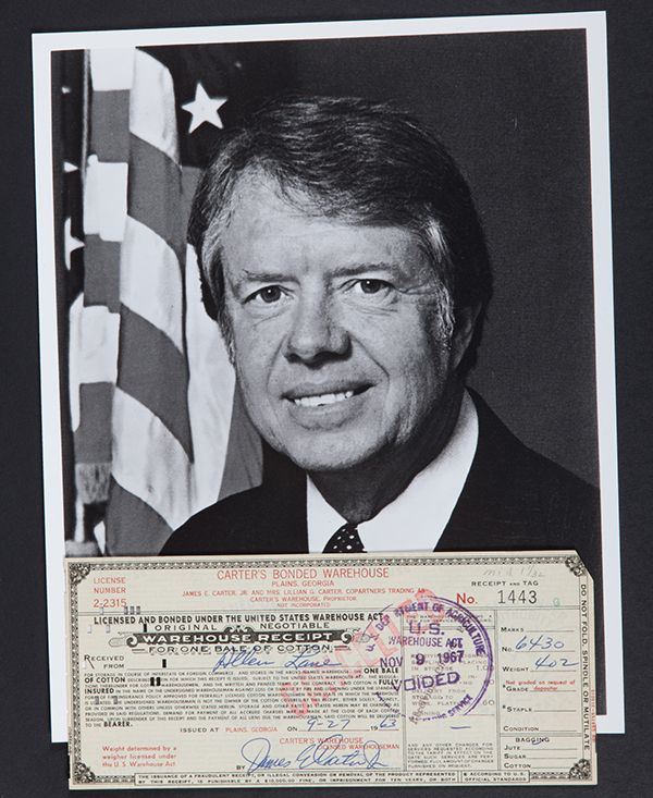 Carter, James E (1924 -) 39th President of the United States (1977-1981). Document signed ("James E Carter Jr.) as copartner with his mother of Carter's Bonded Warehouse, 7� x 3� in., Plains, Georgia, 27 Sept.1963. A receipt for one bale of cotton. With stamp of U.S. Dept. of Agriculture. Signed in blue ball point. Accompanied by an 8 x 10 in. photo print.