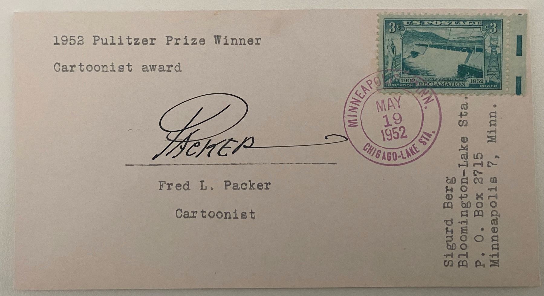 Cartoonist Fred L. Packer signed envelope. 3x6inches