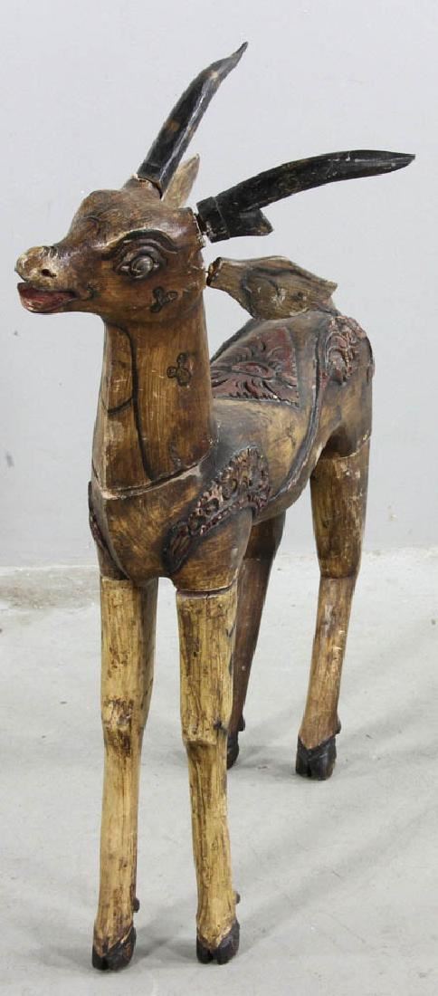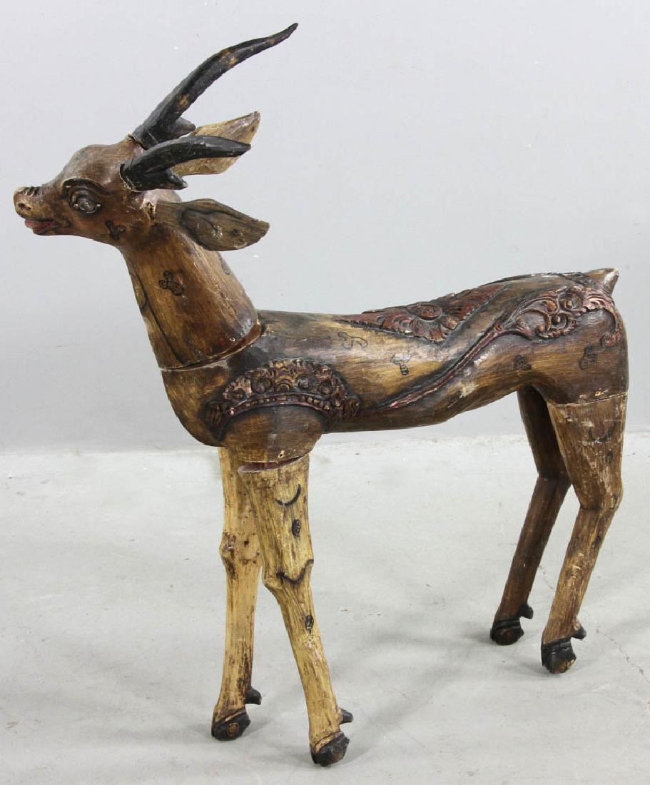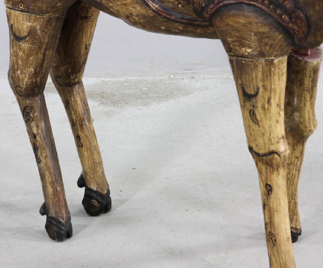 Carved and paint-decorated wooden reindeer, approximately 29 1/2" H x 26" L.