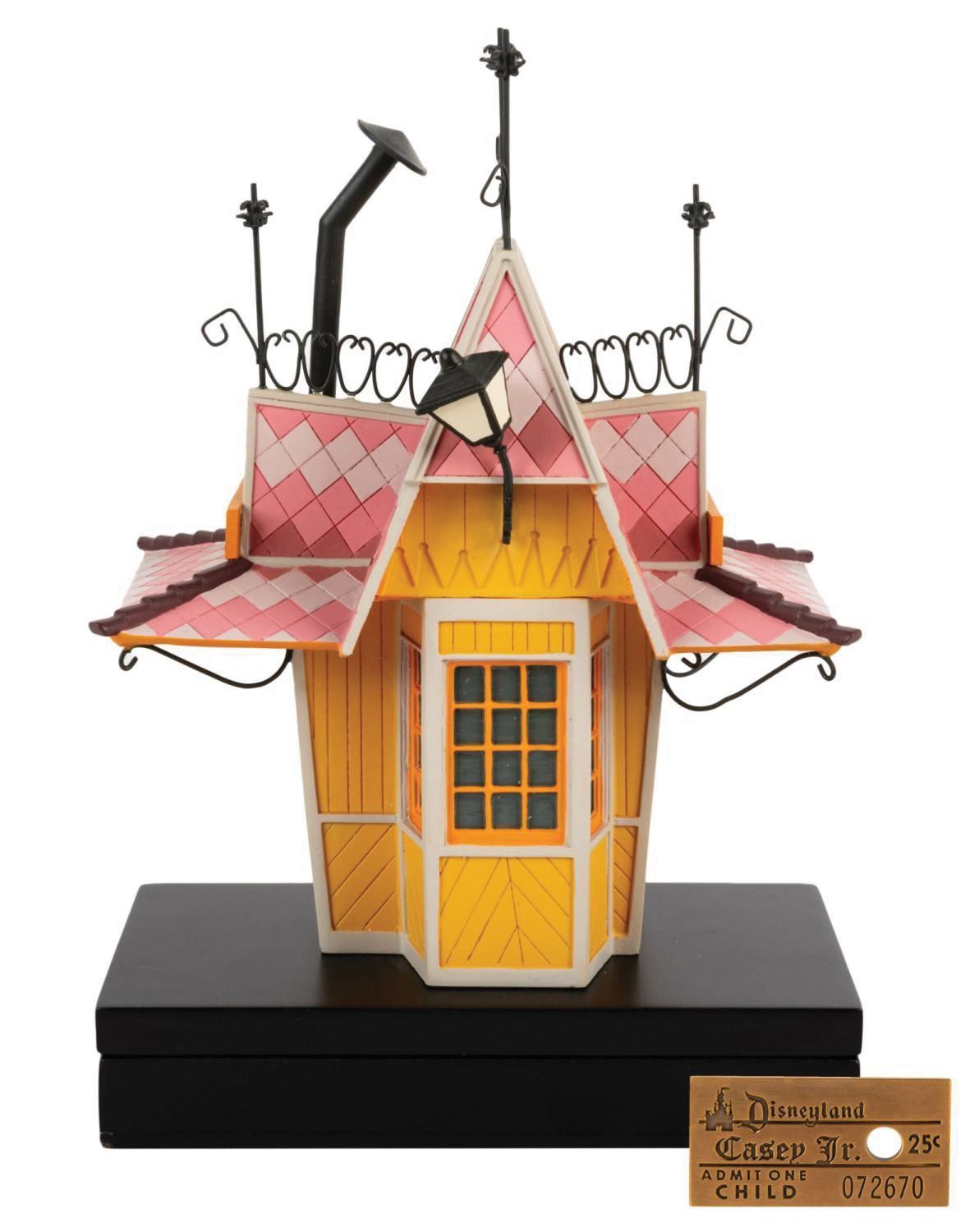 (Disneyland, 2005) A charming trinket box based on the ticket booth for the Casey Jr. Train Station. Created by Kevin Kidney and Jody Daily, the replica was based on the station from the 1954 Walt Disney Production short "Pigs is Pigs," which was later utilized for the Casey Junior Depot ticket kiosk at Disneyland in 1955. The trinket box was limited to an edition of 1,500 for the 50th anniversary of Disneyland and includes a themed pin in the base. Measuring 8" tall, the replica is in very good condition."