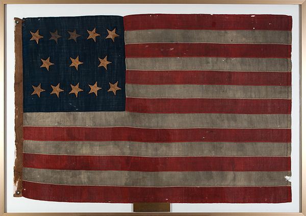 [centennial Flag] 13 Star Flag in Very Rare 5-3-5 Star Pattern. 1876 Centennial flag with 13 stars in 5-3-5 pattern and 13 stripes. Wool bunting, machine sewn, 53 x 34 in. Framed to 58� x 41� in. The two painted-over stars are a mystery. Perhaps the family who owned it lost two sons to war.