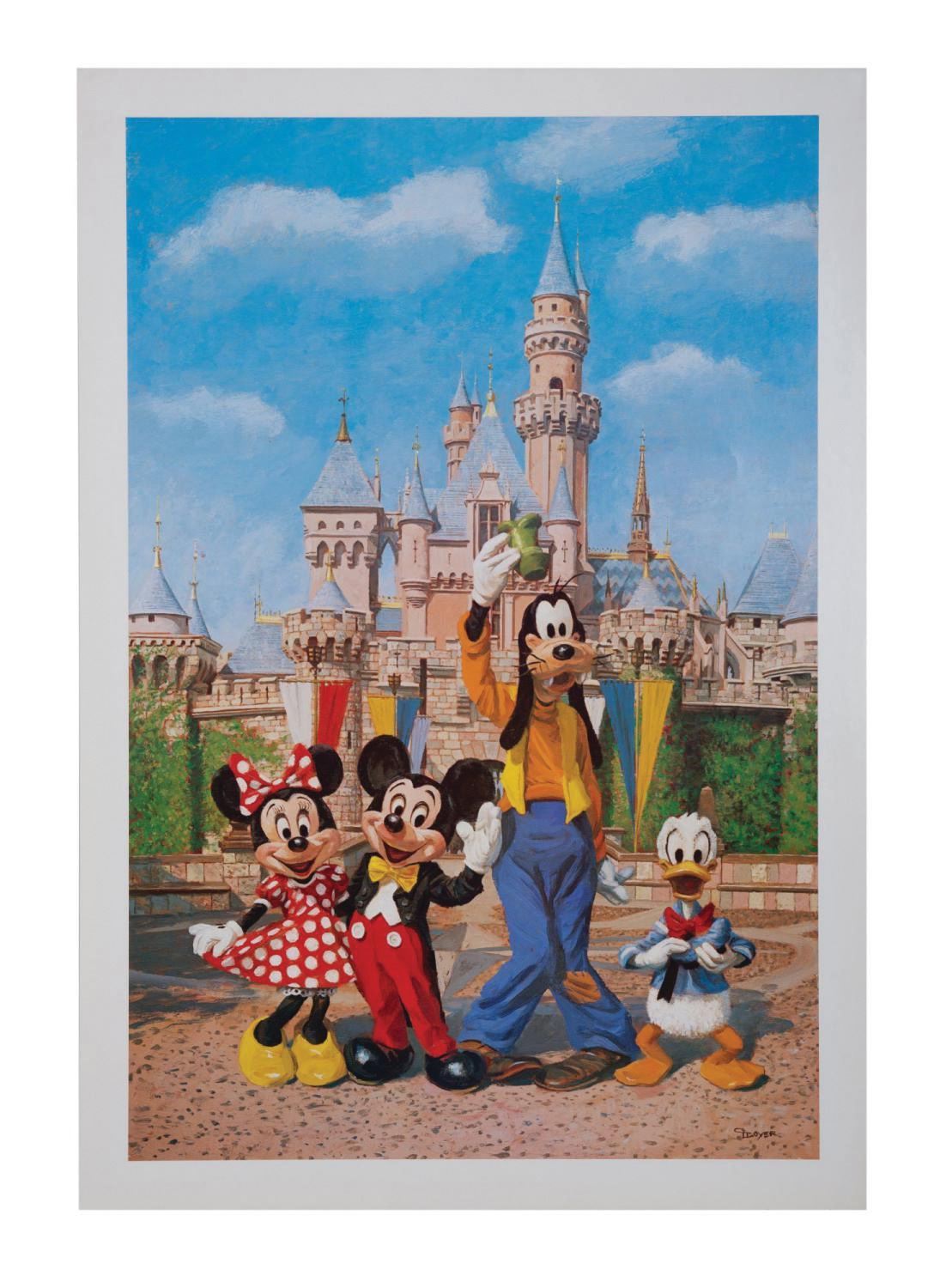 (Disneyland, c.1980s) A stunning lithographic print of the Charles Boyer composition, "Magical Smiles I." Featuring Mickey Mouse, Minnie Mouse, Goofy, and Donald Duck posed in front of Sleeping Beauty Castle, Boyer's piece celebrates whimsical grandeur of the park in the artist's nostalgic, Norman Rockwell-influenced style. Measuring a large 34.75"x24" with an image size of 31.75"x21", it is in very good condition with minor wear to the extreme edges.